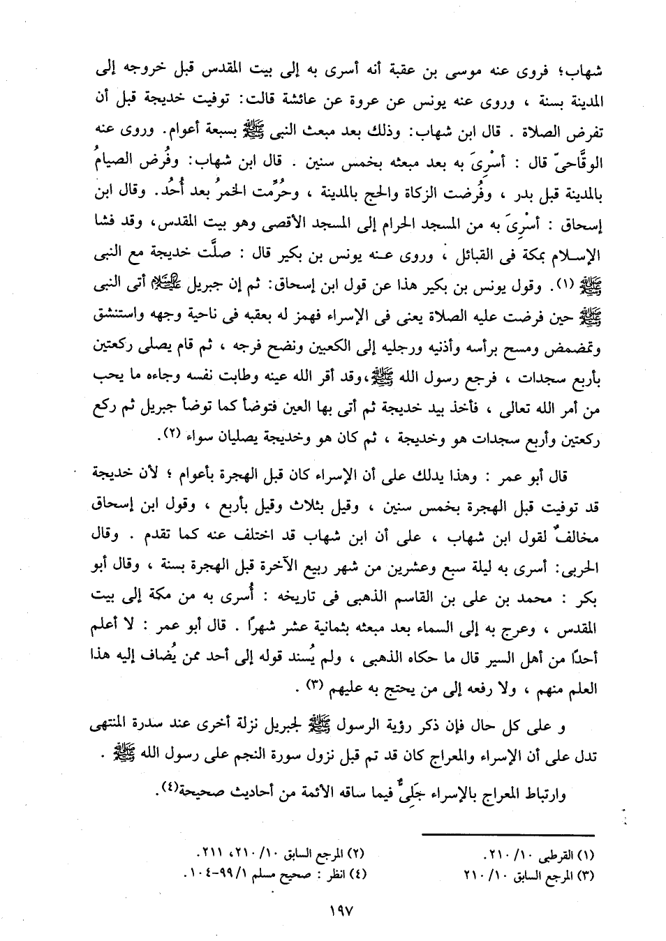 قال أبو عمر: وهذا يدلك على أن الإسراء كان قبل الهجرة بأعوام؛ لأن خديجة قد توفيت قبل الهجرة بخمس سنين، وقيل بثلاث وقيل بأربع، وقول ابن إسحاق مخالف لقول ابن شهاب، على أن ابن شهاب قد اختلف عنه كما تقدم. وقال الحربى: أسرى به ليلة سبع وعشرين من شهر ربيع الآخرة قبل الهجرة بسنة، وقال أبو بكر: محمد بن