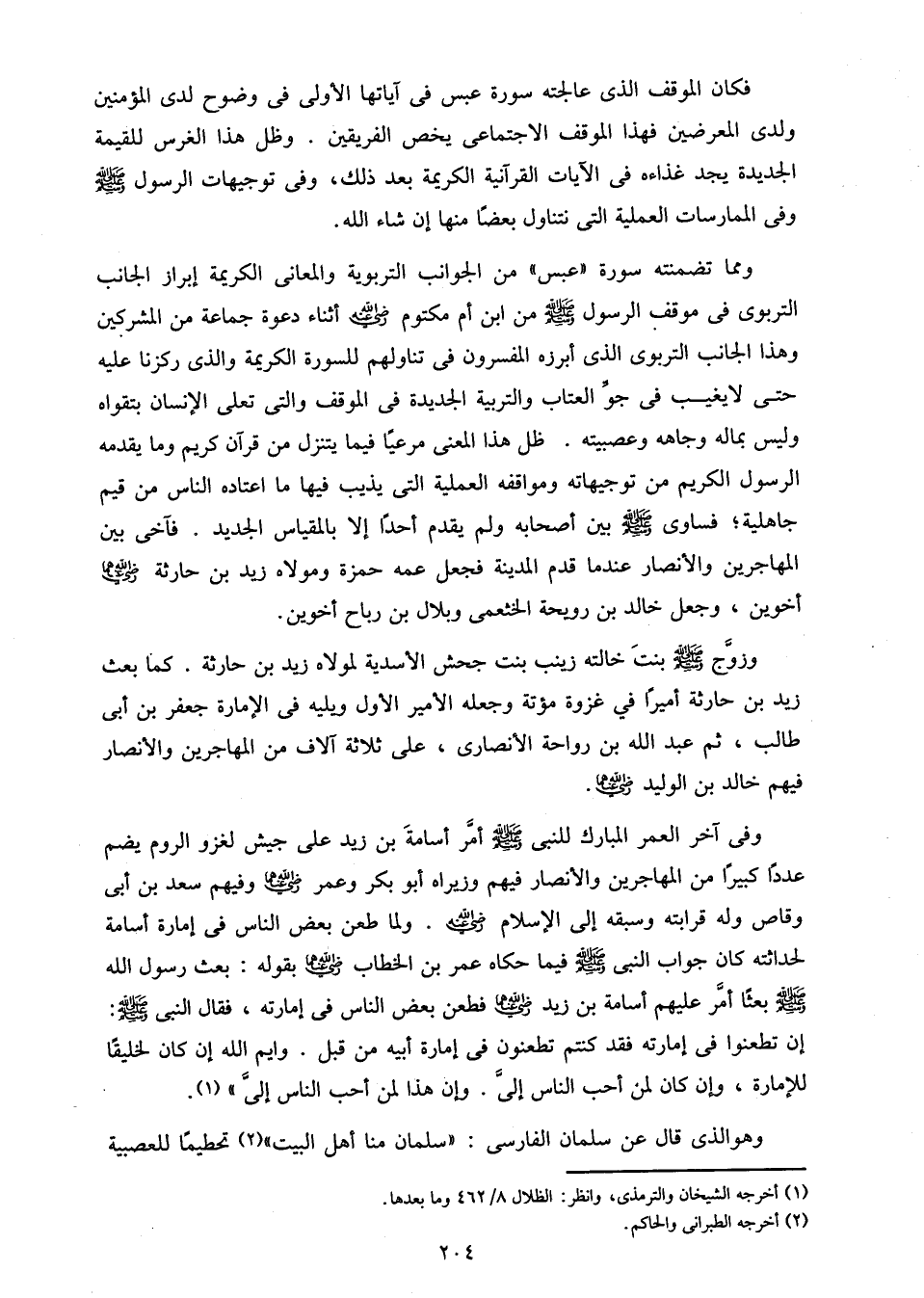 دعوة جماعة من المشركين وهذا الجانب التربوى الذى أبرزه المفسرون فى تناولهم للسورة الكريمة والذى ركزنا عليه حتى لا يغيب فى جوّ العتاب والتربية الجديدة فى الموقف والتى تعلى الإنسان بتقواه وليس بماله وجاهه وعصبيته. ظل هذا المعنى مرعيا فيما يتنزل من قرآن كريم وما يقدمه الرسول الكريم من توجيهاته ومواقفه العملية التى يذيب فيها ما اعتاده الناس من قيم جاهلية؛ فساوى صلّى الله عليه وسلم بين أصحابه ولم يقدم أحدا إلا بالمقياس الجديد. فآخى بين المهاجرين والأنصار عند ما قدم المدينة فجعل عمه حمزة ومولاه زيد بن حارثة رضي الله عنهما أخوين، وجعل خالد بن رويحة الخثعمى وبلال بن رباح أخوين.