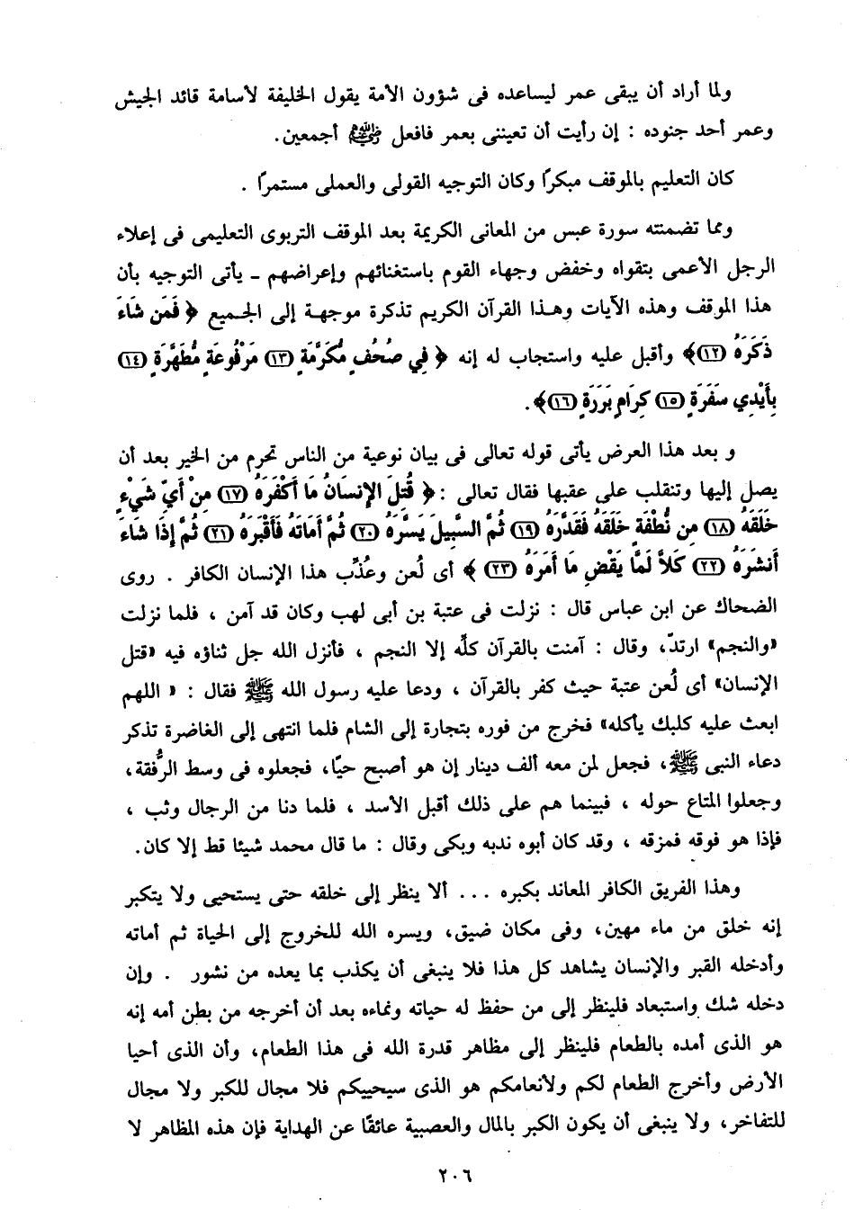 وبعد هذا العرض يأتى قوله تعالى فى بيان نوعية من الناس تحرم من الخير بعد أن يصل إليها وتنقلب على عقبها فقال تعالى: قُتِلَ الْإِنْسانُ ما أَكْفَرَهُ (17) مِنْ أَيِّ شَيْءٍ خَلَقَهُ (18) مِنْ نُطْفَةٍ خَلَقَهُ فَقَدَّرَهُ (19) ثُمَّ السَّبِيلَ يَسَّرَهُ (20) ثُمَّ أَماتَهُ فَأَقْبَرَهُ (21) ثُمَّ إِذا شاءَ أَنْشَرَهُ (22) كَلَّا لَمَّا يَقْضِ ما أَمَرَهُ (23) أى لعن وعذّب هذا الإنسان الكافر. روى الضحاك عن ابن عباس قال: نزلت فى عتبة بن أبى لهب وكان قد آمن، فلما نزلت «والنجم» ارتدّ، وقال: آمنت بالقرآن كلّه إلا النجم، فأنزل الله جل ثناؤه فيه «قتل الإنسان» أى لعن عتبة حيث كفر بالقرآن، ودعا عليه رسول الله صلّى الله عليه وسلم فقال: «اللهم ابعث عليه كلبك يأكله» فخرج من فوره بتجارة إلى الشام فلما انتهى إلى الغاضرة تذكر دعاء النبى صلّى الله عليه وسلم، فجعل لمن معه ألف دينار إن هو أصبح حيا، فجعلوه فى وسط الرّفقة، وجعلوا المتاع حوله، فبينما هم على ذلك أقبل الأسد، فلما دنا من الرجال وثب، فإذا هو فوقه فمزقه، وقد كان أبوه ندبه وبكى وقال: ما قال محمد شيئا قط إلا كان.