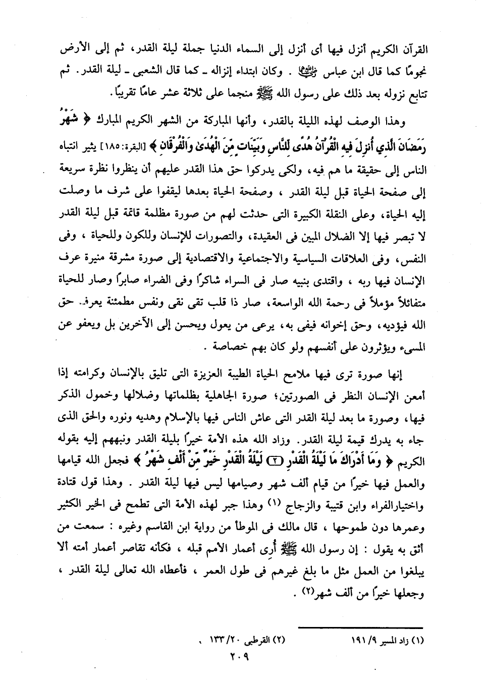 إنها صورة ترى فيها ملامح الحياة الطيبة العزيزة التى تليق بالإنسان وكرامته إذا أمعن الإنسان النظر فى الصورتين؛ صورة الجاهلية بظلماتها وضلالها وخمول الذكر فيها، وصورة ما بعد ليلة القدر التى عاش الناس فيها بالإسلام وهديه ونوره والحق الذى جاء به يدرك قيمة ليلة القدر. وزاد الله هذه الأمة خيرا بليلة القدر ونبههم إليه بقوله الكريم وَما أَدْراكَ ما لَيْلَةُ الْقَدْرِ (2) لَيْلَةُ الْقَدْرِ خَيْرٌ مِنْ أَلْفِ شَهْرٍ فجعل الله قيامها والعمل فيها خيرا من قيام ألف شهر وصيامها ليس فيها ليلة القدر. وهذا قول قتادة واختيار الفراء وابن قتيبة والزجاج «1» وهذا جبر لهذه الأمة التى تطمح فى الخير الكثير وعمرها دون طموحها، قال مالك فى الموطأ من رواية ابن القاسم وغيره: سمعت من أثق به يقول: إن رسول الله صلّى الله عليه وسلم أرى أعمار الأمم قبله، فكأنه تقاصر أعمار أمته ألا يبلغوا من العمل مثل ما بلغ غيرهم فى طول العمر، فأعطاه الله تعالى ليلة القدر، وجعلها خيرا من ألف شهر «2».