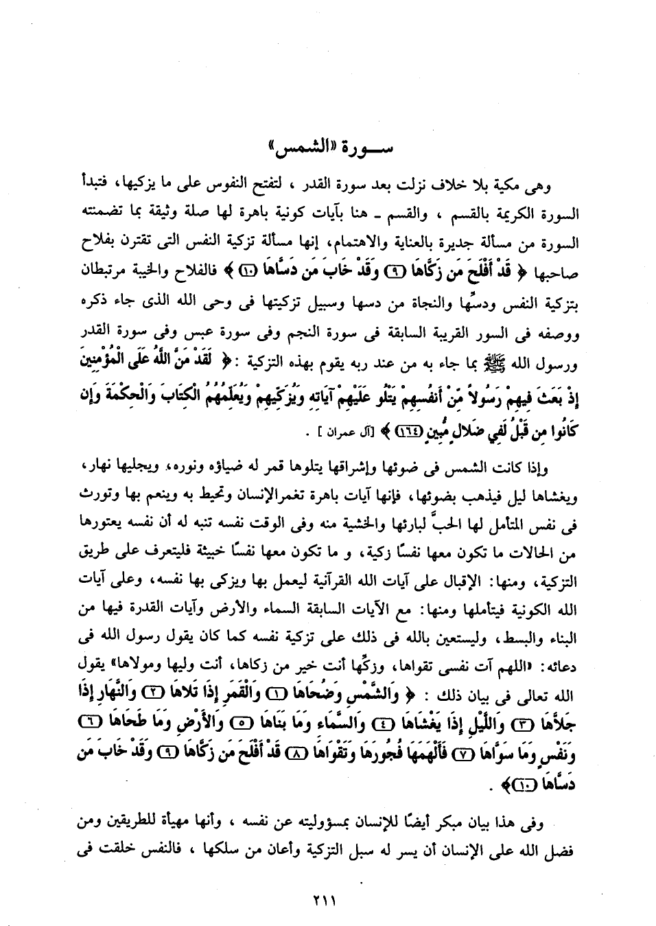 وهى مكية بلا خلاف نزلت بعد سورة القدر، لتفتح النفوس على ما يزكيها، فتبدأ السورة الكريمة بالقسم، والقسم- هنا بآيات كونية باهرة لها صلة وثيقة بما تضمنته السورة من مسألة جديرة بالعناية والاهتمام، إنها مسألة تزكية النفس التى تقترن بفلاح صاحبها قَدْ أَفْلَحَ مَنْ زَكَّاها (9) وَقَدْ خابَ مَنْ دَسَّاها (10) فالفلاح والخيبة مرتبطان بتزكية النفس ودسّها والنجاة من دسها وسبيل تزكيتها فى وحى الله الذى جاء ذكره ووصفه فى السور القريبة السابقة فى سورة النجم وفى سورة عبس وفى سورة القدر ورسول الله صلّى الله عليه وسلم بما جاء به من عند ربه يقوم بهذه التزكية: لَقَدْ مَنَّ اللَّهُ عَلَى الْمُؤْمِنِينَ إِذْ بَعَثَ فِيهِمْ رَسُولًا مِنْ أَنْفُسِهِمْ يَتْلُوا عَلَيْهِمْ آياتِهِ وَيُزَكِّيهِمْ وَيُعَلِّمُهُمُ الْكِتابَ وَالْحِكْمَةَ وَإِنْ كانُوا مِنْ قَبْلُ لَفِي ضَلالٍ مُبِينٍ (164) [آل عمران].