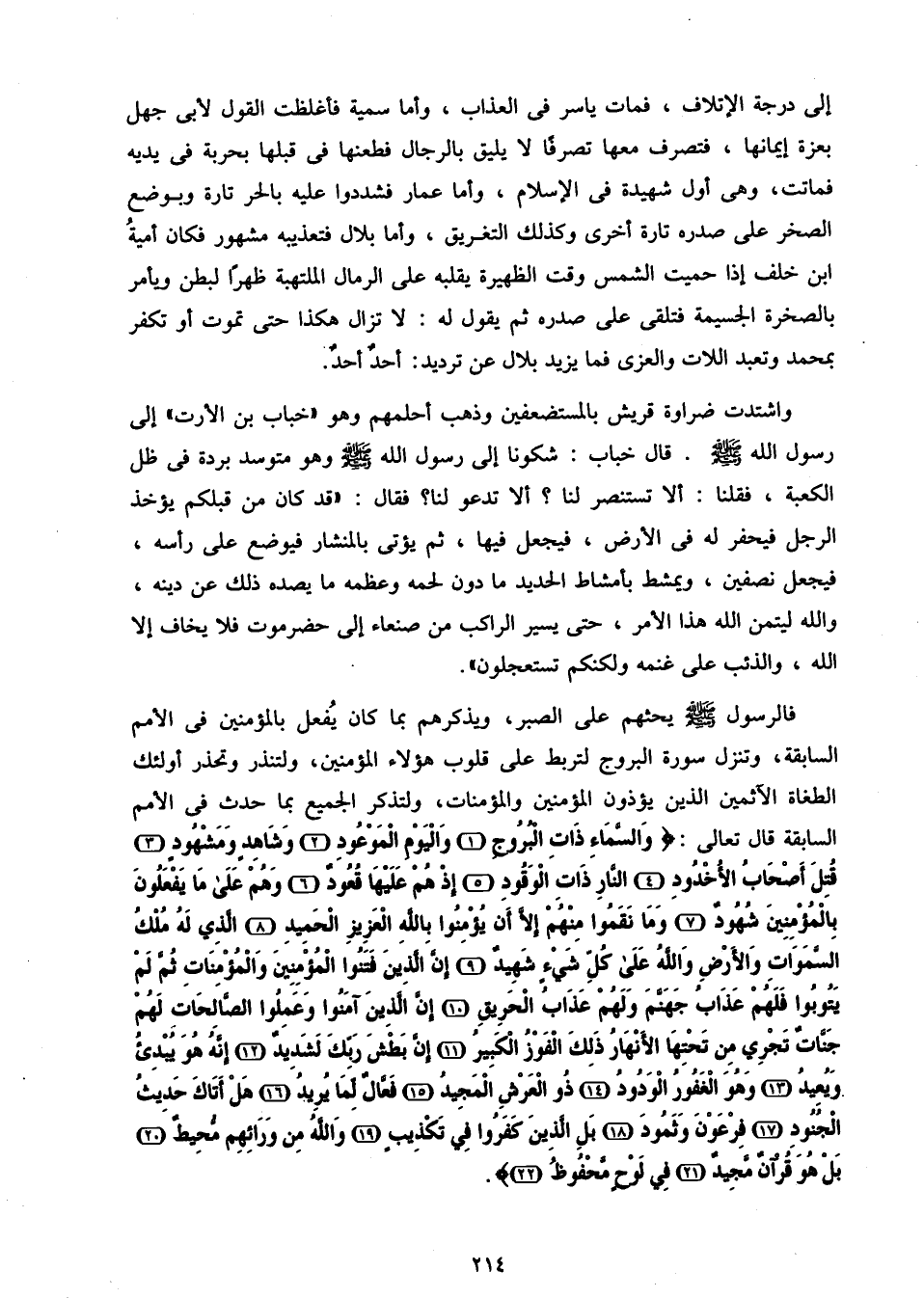 فالرسول صلّى الله عليه وسلم يحثهم على الصبر، ويذكرهم بما كان يفعل بالمؤمنين فى الأمم السابقة، وتنزل سورة البروج لتربط على قلوب هؤلاء المؤمنين، ولتنذر وتحذر أولئك الطغاة الآثمين الذين يؤذون المؤمنين والمؤمنات، ولتذكر الجميع بما حدث فى الأمم السابقة قال تعالى: وَالسَّماءِ ذاتِ الْبُرُوجِ (1) وَالْيَوْمِ الْمَوْعُودِ (2) وَشاهِدٍ وَمَشْهُودٍ (3) قُتِلَ أَصْحابُ الْأُخْدُودِ (4) النَّارِ ذاتِ الْوَقُودِ (5) إِذْ هُمْ عَلَيْها قُعُودٌ (6) وَهُمْ عَلى ما يَفْعَلُونَ بِالْمُؤْمِنِينَ شُهُودٌ (7) وَما نَقَمُوا مِنْهُمْ إِلَّا أَنْ يُؤْمِنُوا بِاللَّهِ الْعَزِيزِ الْحَمِيدِ (8) الَّذِي لَهُ مُلْكُ السَّماواتِ وَالْأَرْضِ وَاللَّهُ عَلى كُلِّ شَيْءٍ شَهِيدٌ (9) إِنَّ الَّذِينَ فَتَنُوا الْمُؤْمِنِينَ وَالْمُؤْمِناتِ ثُمَّ لَمْ يَتُوبُوا فَلَهُمْ عَذابُ جَهَنَّمَ وَلَهُمْ عَذابُ الْحَرِيقِ (10) إِنَّ الَّذِينَ آمَنُوا وَعَمِلُوا الصَّالِحاتِ لَهُمْ جَنَّاتٌ تَجْرِي مِنْ تَحْتِهَا الْأَنْهارُ ذلِكَ الْفَوْزُ الْكَبِيرُ (11) إِنَّ بَطْشَ رَبِّكَ لَشَدِيدٌ (12) إِنَّهُ هُوَ يُبْدِئُ وَيُعِيدُ (13) وَهُوَ الْغَفُورُ الْوَدُودُ (14) ذُو الْعَرْشِ الْمَجِيدُ (15) فَعَّالٌ لِما يُرِيدُ (16) هَلْ أَتاكَ حَدِيثُ الْجُنُودِ (17) فِرْعَوْنَ وَثَمُودَ (18) بَلِ الَّذِينَ كَفَرُوا فِي تَكْذِيبٍ (19) وَاللَّهُ مِنْ وَرائِهِمْ مُحِيطٌ (20) بَلْ هُوَ قُرْآنٌ مَجِيدٌ (21) فِي لَوْحٍ مَحْفُوظٍ (22).