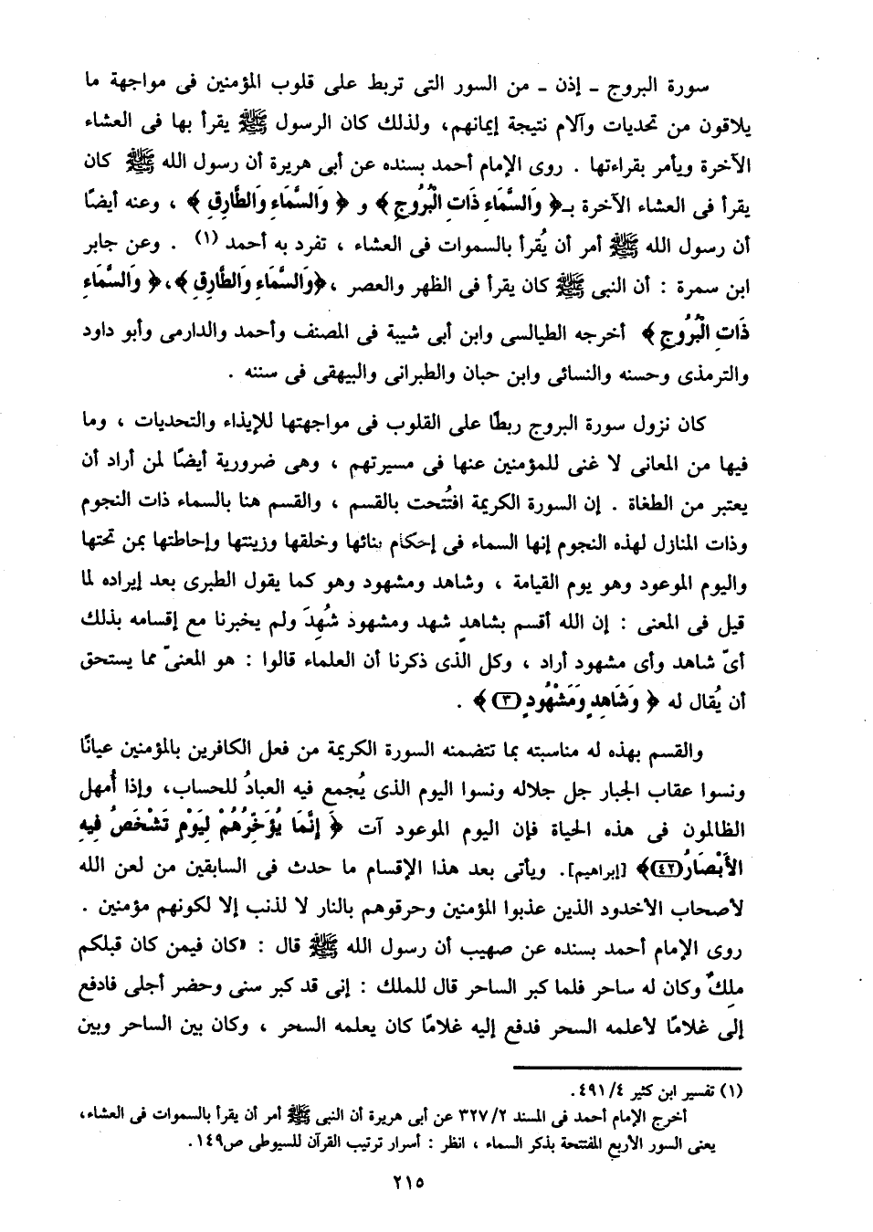 سورة البروج- إذن- من السور التى تربط على قلوب المؤمنين فى مواجهة ما يلاقون من تحديات وآلام نتيجة إيمانهم، ولذلك كان الرسول صلّى الله عليه وسلم يقرأ بها فى العشاء الآخرة ويأمر بقراءتها. روى الإمام أحمد بسنده عن أبى هريرة أن رسول الله صلّى الله عليه وسلم كان يقرأ فى العشاء الآخرة ب وَالسَّماءِ ذاتِ الْبُرُوجِ ووَ السَّماءِ وَالطَّارِقِ، وعنه أيضا أن رسول الله صلّى الله عليه وسلم أمر أن يقرأ بالسماوات فى العشاء، تفرد به أحمد «1». وعن جابر ابن سمرة: أن النبى صلّى الله عليه وسلم كان يقرأ فى الظهر والعصر، وَالسَّماءِ وَالطَّارِقِ، وَالسَّماءِ ذاتِ الْبُرُوجِ أخرجه الطيالسى وابن أبى شيبة فى المصنف وأحمد والدارمى وأبو داود والترمذى وحسنه والنسائى وابن حبان والطبرانى والبيهقى فى سننه.
