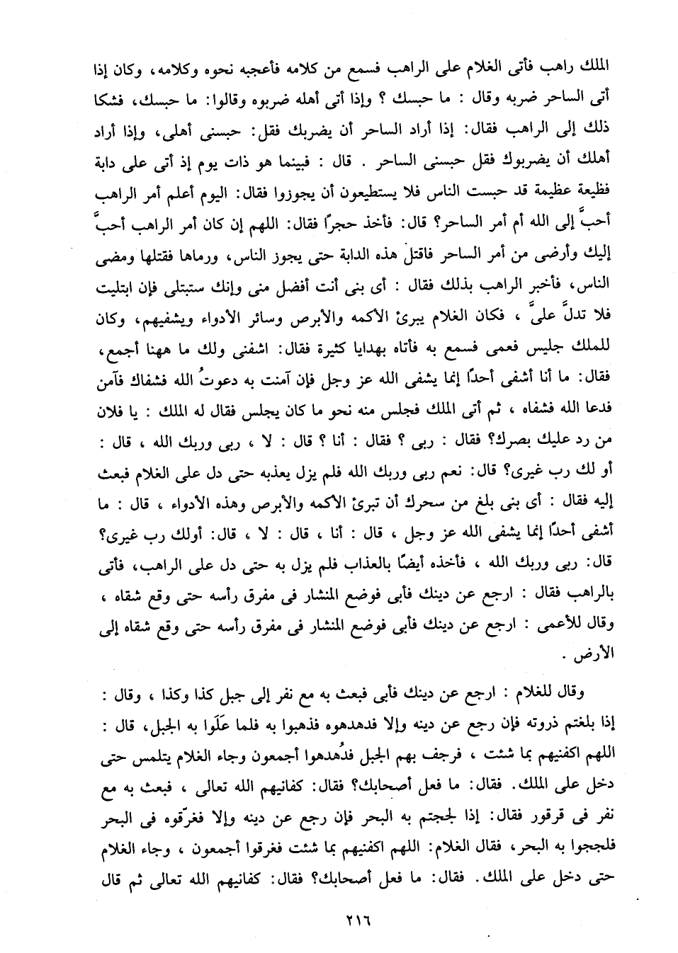 الملك راهب فأتى الغلام على الراهب فسمع من كلامه فأعجبه نحوه وكلامه، وكان إذا أتى الساحر ضربه وقال: ما حبسك؟ وإذا أتى أهله ضربوه وقالوا: ما حبسك، فشكا ذلك إلى الراهب فقال: إذا أراد الساحر أن يضربك فقل: حبسنى أهلى، وإذا أراد أهلك أن يضربوك فقل حبسنى الساحر. قال: فبينما هو ذات يوم إذ أتى على دابة فظيعة عظيمة قد حبست الناس فلا يستطيعون أن يجوزوا فقال: اليوم أعلم أمر الراهب أحبّ إلى الله أم أمر الساحر؟ قال: فأخذ حجرا فقال: اللهم إن كان أمر الراهب أحبّ إليك وأرضى من أمر الساحر فاقتل هذه الدابة حتى يجوز الناس، ورماها فقتلها ومضى الناس، فأخبر الراهب بذلك فقال: أى بنى أنت أفضل منى وإنك ستبتلى فإن ابتليت فلا