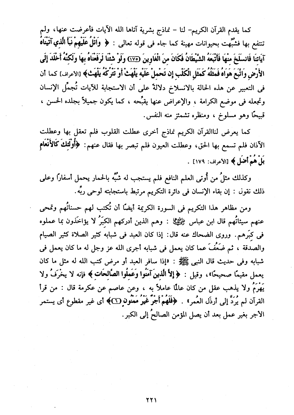 كما يقدم القرآن الكريم- لنا- نماذج بشرية آتاها الله الآيات فأعرضت عنها، ولم تنتفع بها فشبّهت بحيوانات مهينة كما جاء فى قوله تعالى: وَاتْلُ عَلَيْهِمْ نَبَأَ الَّذِي آتَيْناهُ آياتِنا فَانْسَلَخَ مِنْها فَأَتْبَعَهُ الشَّيْطانُ فَكانَ مِنَ الْغاوِينَ (175) وَلَوْ شِئْنا لَرَفَعْناهُ بِها وَلكِنَّهُ أَخْلَدَ إِلَى الْأَرْضِ وَاتَّبَعَ هَواهُ فَمَثَلُهُ كَمَثَلِ الْكَلْبِ إِنْ تَحْمِلْ عَلَيْهِ يَلْهَثْ أَوْ تَتْرُكْهُ يَلْهَثْ [الأعراف] كما أن فى التعبير عن هذه الحالة بالانسلاخ دلالة على أن الاستجابة للآيات تجمّل الإنسان وتجعله فى موضع الكرامة، والإعراض عنها يقبّحه، كما يكون جميلا بجلده الحسن، قبيحا وهو مسلوخ، ومنظره تشمئز منه النفس.