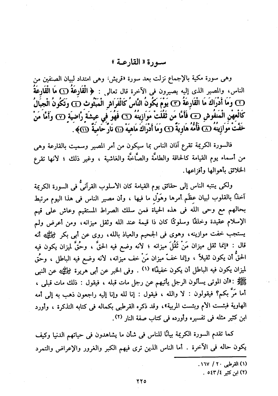 وهى سورة مكية بالإجماع نزلت بعد سورة «قريش» وهى امتداد لبيان الصنفين من الناس، والمصير الذى إليه يصيرون فى الآخرة قال تعالى: الْقارِعَةُ (1) مَا الْقارِعَةُ (2) وَما أَدْراكَ مَا الْقارِعَةُ (3) يَوْمَ يَكُونُ النَّاسُ كَالْفَراشِ الْمَبْثُوثِ (4) وَتَكُونُ الْجِبالُ كَالْعِهْنِ الْمَنْفُوشِ (5) فَأَمَّا مَنْ ثَقُلَتْ مَوازِينُهُ (6) فَهُوَ فِي عِيشَةٍ راضِيَةٍ (7) وَأَمَّا مَنْ خَفَّتْ مَوازِينُهُ (8) فَأُمُّهُ هاوِيَةٌ (9) وَما أَدْراكَ ما هِيَهْ (10) نارٌ حامِيَةٌ (11).