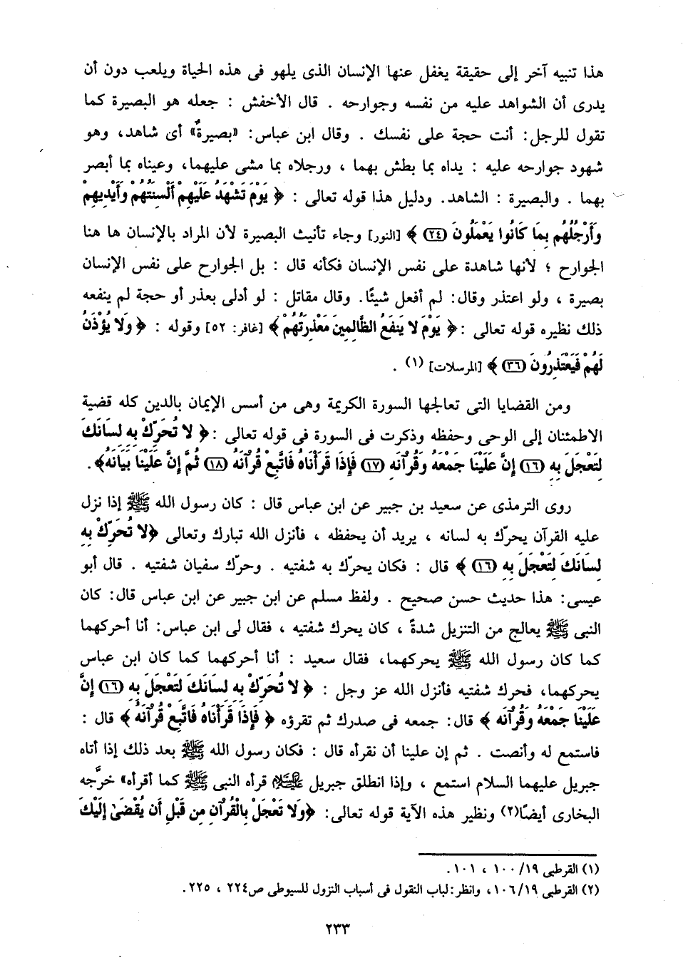 روى الترمذى عن سعيد بن جبير عن ابن عباس قال: كان رسول الله صلّى الله عليه وسلم إذا نزل عليه القرآن يحرّك به لسانه، يريد أن يحفظه، فأنزل الله تبارك وتعالى لا تُحَرِّكْ بِهِ لِسانَكَ لِتَعْجَلَ بِهِ (16) قال: فكان يحرّك به شفتيه. وحرّك سفيان شفتيه. قال أبو عيسى: هذا حديث حسن صحيح. ولفظ مسلم عن ابن جبير عن ابن عباس قال: كان النبى صلّى الله عليه وسلم يعالج من التنزيل شدة، كان يحرك شفتيه، فقال لى ابن عباس: أنا أحركهما كما كان رسول الله صلّى الله عليه وسلم يحركهما، فقال سعيد: أنا أحركهما كما كان ابن عباس يحركهما، فحرك شفتيه فأنزل الله عز وجل: لا تُحَرِّكْ بِهِ لِسانَكَ لِتَعْجَلَ بِهِ (16) إِنَّ عَلَيْنا جَمْعَهُ وَقُرْآنَهُ قال: جمعه فى صدرك ثم تقرؤه فَإِذا قَرَأْناهُ فَاتَّبِعْ قُرْآنَهُ قال: