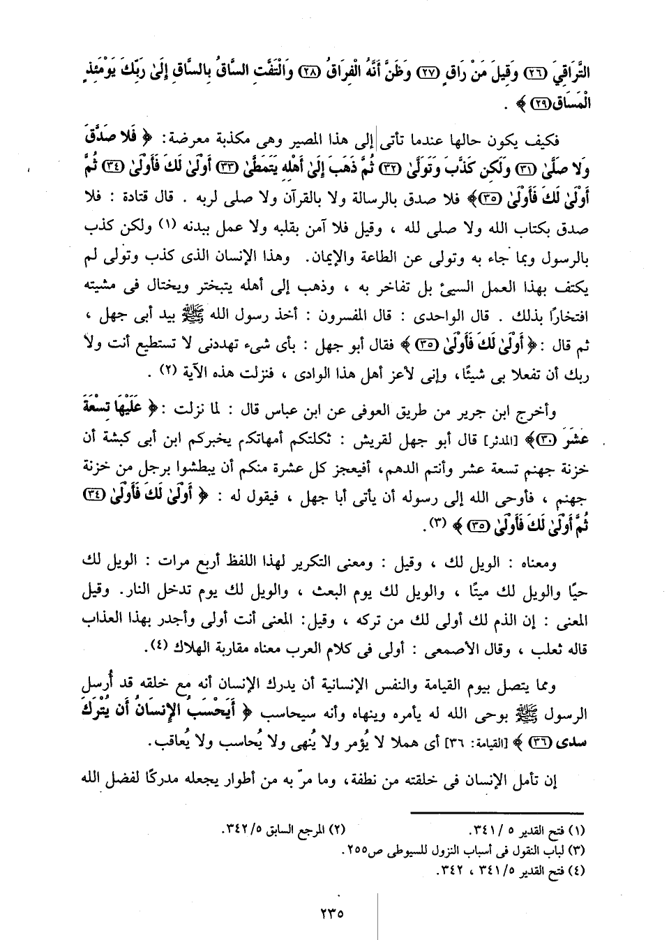 فكيف يكون حالها عند ما تأتى إلى هذا المصير وهى مكذبة معرضة: فَلا صَدَّقَ وَلا صَلَّى (31) وَلكِنْ كَذَّبَ وَتَوَلَّى (32) ثُمَّ ذَهَبَ إِلى أَهْلِهِ يَتَمَطَّى (33) أَوْلى لَكَ فَأَوْلى (34) ثُمَّ أَوْلى لَكَ فَأَوْلى (35) فلا صدق بالرسالة ولا بالقرآن ولا صلى لربه. قال قتادة: فلا صدق بكتاب الله ولا صلى لله، وقيل فلا آمن بقلبه ولا عمل ببدنه «1» ولكن كذب بالرسول وبما جاء به وتولى عن الطاعة والإيمان. وهذا الإنسان الذى كذب وتولى لم يكتف بهذا العمل السيئ بل تفاخر به، وذهب إلى أهله يتبختر ويختال فى مشيته افتخارا بذلك. قال الواحدى: قال المفسرون: أخذ رسول الله صلّى الله عليه وسلم بيد أبى جهل، ثم قال: أَوْلى لَكَ فَأَوْلى (35) فقال أبو جهل: بأى شىء تهددنى لا تستطيع أنت ولا ربك أن تفعلا بى شيئا، وإنى لأعز أهل هذا الوادى، فنزلت هذه الآية «2».