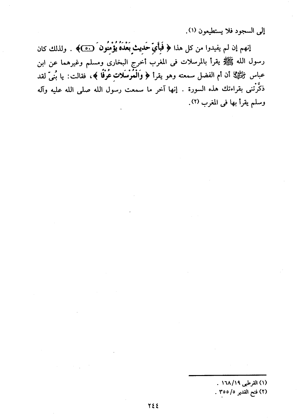 إنهم إن لم يفيدوا من كل هذا فَبِأَيِّ حَدِيثٍ بَعْدَهُ يُؤْمِنُونَ (50). ولذلك كان رسول الله صلّى الله عليه وسلم يقرأ بالمرسلات فى المغرب أخرج البخارى ومسلم وغيرهما عن ابن عباس رضي الله عنهما أن أم الفضل سمعته وهو يقرأ وَالْمُرْسَلاتِ عُرْفاً، فقالت: يا بنىّ لقد ذكّرتنى بقراءتك هذه السورة. إنها آخر ما سمعت رسول الله صلّى الله عليه وآله وسلم يقرأ بها فى المغرب «2».