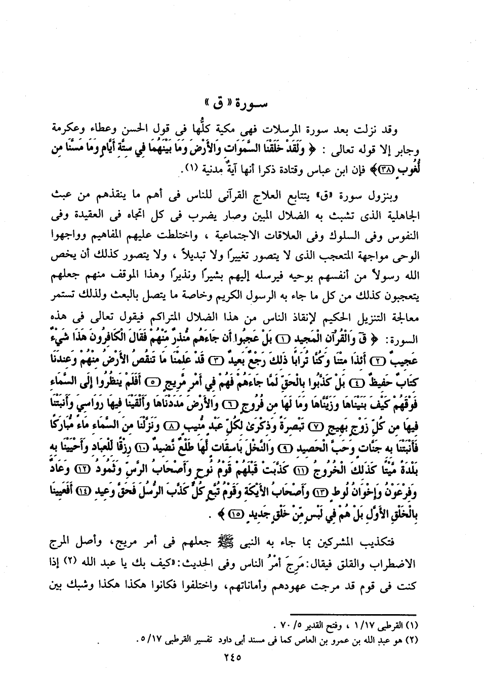 وبنزول سورة «ق» يتتابع العلاج القرآنى للناس فى أهم ما ينقذهم من عبث الجاهلية الذى تشبث به الضلال المبين وصار يضرب فى كل اتجاه فى العقيدة وفى النفوس وفى السلوك وفى العلاقات الاجتماعية، واختلطت عليهم المفاهيم وواجهوا الوحى مواجهة المتعجب الذى لا يتصور تغييرا ولا تبديلا، ولا يتصور كذلك أن يخص الله رسولا من أنفسهم بوحيه فيرسله إليهم بشيرا ونذيرا وهذا الموقف منهم جعلهم يتعجبون كذلك من كل ما جاء به الرسول الكريم وخاصة ما يتصل بالبعث ولذلك تستمر معالجة التنزيل الحكيم لإنقاذ الناس من هذا الضلال المتراكم فيقول تعالى فى هذه السورة: ق وَالْقُرْآنِ الْمَجِيدِ (1) بَلْ عَجِبُوا أَنْ جاءَهُمْ مُنْذِرٌ مِنْهُمْ فَقالَ الْكافِرُونَ هذا شَيْءٌ عَجِيبٌ (2) أَإِذا مِتْنا وَكُنَّا تُراباً ذلِكَ رَجْعٌ بَعِيدٌ (3) قَدْ عَلِمْنا ما تَنْقُصُ الْأَرْضُ مِنْهُمْ وَعِنْدَنا كِتابٌ حَفِيظٌ (4) بَلْ كَذَّبُوا بِالْحَقِّ لَمَّا جاءَهُمْ فَهُمْ فِي أَمْرٍ مَرِيجٍ (5) أَفَلَمْ يَنْظُرُوا إِلَى