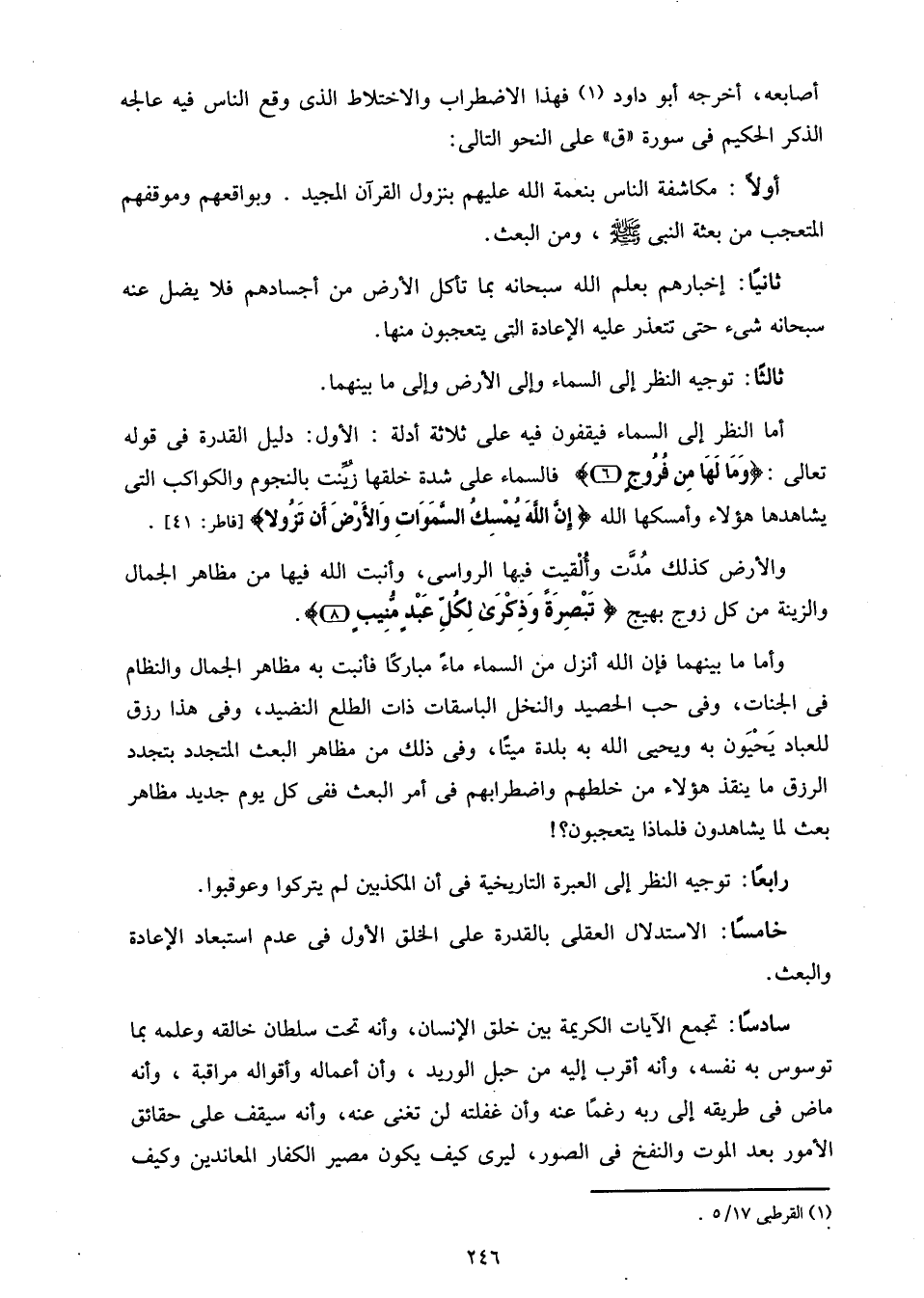 أصابعه، أخرجه أبو داود «1» فهذا الاضطراب والاختلاط الذى وقع الناس فيه عالجه الذكر الحكيم فى سورة «ق» على النحو التالى:
