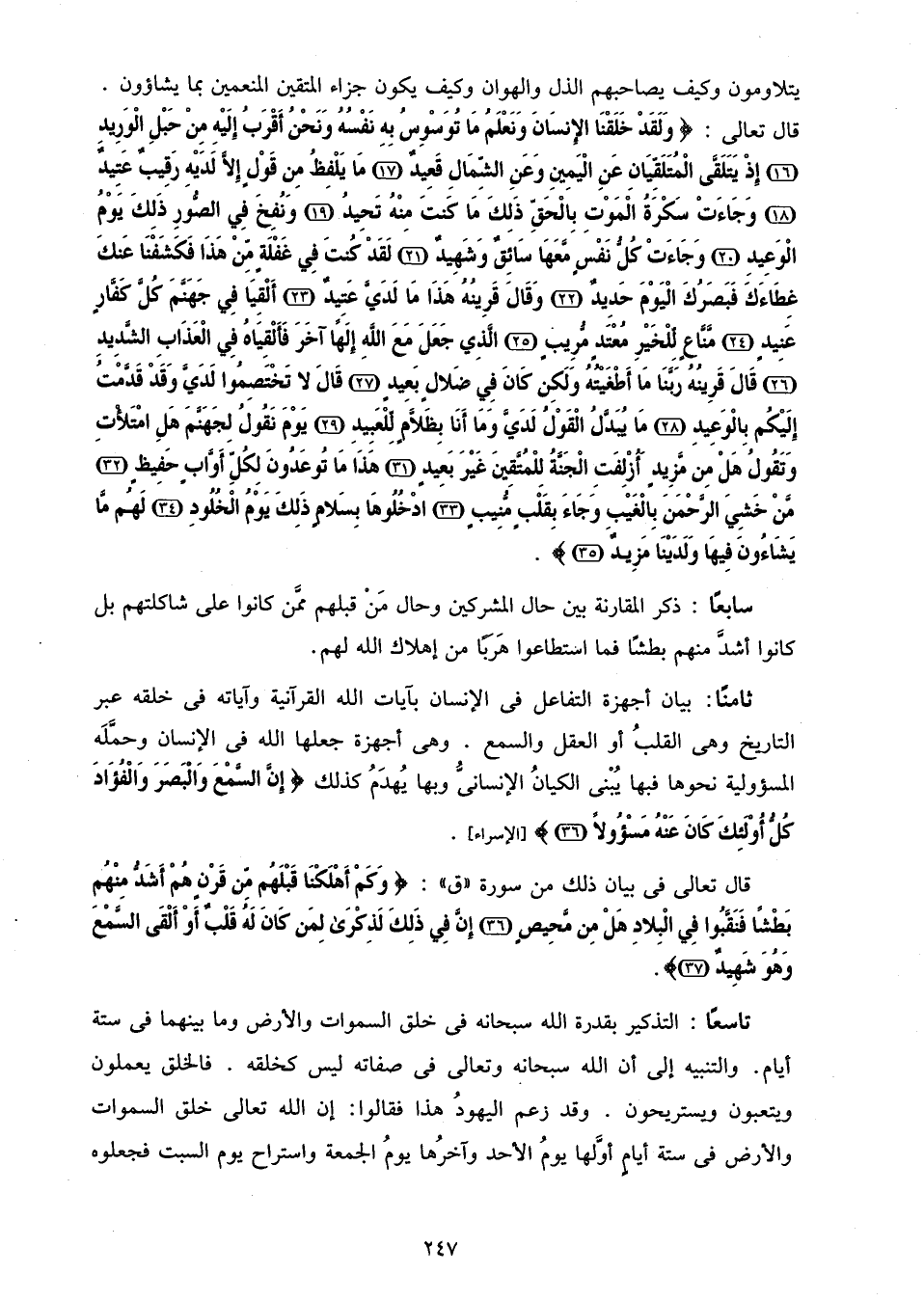 قال تعالى: وَلَقَدْ خَلَقْنَا الْإِنْسانَ وَنَعْلَمُ ما تُوَسْوِسُ بِهِ نَفْسُهُ وَنَحْنُ أَقْرَبُ إِلَيْهِ مِنْ حَبْلِ الْوَرِيدِ (16) إِذْ يَتَلَقَّى الْمُتَلَقِّيانِ عَنِ الْيَمِينِ وَعَنِ الشِّمالِ قَعِيدٌ (17) ما يَلْفِظُ مِنْ قَوْلٍ إِلَّا لَدَيْهِ رَقِيبٌ عَتِيدٌ (18) وَجاءَتْ سَكْرَةُ الْمَوْتِ بِالْحَقِّ ذلِكَ ما كُنْتَ مِنْهُ تَحِيدُ (19) وَنُفِخَ فِي الصُّورِ ذلِكَ يَوْمُ الْوَعِيدِ (20) وَجاءَتْ كُلُّ نَفْسٍ مَعَها سائِقٌ وَشَهِيدٌ (21) لَقَدْ كُنْتَ فِي غَفْلَةٍ مِنْ هذا فَكَشَفْنا عَنْكَ غِطاءَكَ فَبَصَرُكَ الْيَوْمَ حَدِيدٌ (22) وَقالَ قَرِينُهُ هذا ما لَدَيَّ عَتِيدٌ (23) أَلْقِيا فِي جَهَنَّمَ كُلَّ كَفَّارٍ عَنِيدٍ (24) مَنَّاعٍ لِلْخَيْرِ مُعْتَدٍ مُرِيبٍ (25) الَّذِي جَعَلَ مَعَ اللَّهِ إِلهاً آخَرَ فَأَلْقِياهُ فِي الْعَذابِ الشَّدِيدِ (26) قالَ قَرِينُهُ رَبَّنا ما أَطْغَيْتُهُ وَلكِنْ كانَ فِي ضَلالٍ بَعِيدٍ (27) قالَ لا تَخْتَصِمُوا لَدَيَّ وَقَدْ قَدَّمْتُ إِلَيْكُمْ بِالْوَعِيدِ (28) ما يُبَدَّلُ الْقَوْلُ لَدَيَّ وَما أَنَا بِظَلَّامٍ لِلْعَبِيدِ (29) يَوْمَ نَقُولُ لِجَهَنَّمَ هَلِ امْتَلَأْتِ وَتَقُولُ هَلْ مِنْ مَزِيدٍ وَأُزْلِفَتِ الْجَنَّةُ لِلْمُتَّقِينَ غَيْرَ بَعِيدٍ (31) هذا ما تُوعَدُونَ لِكُلِّ أَوَّابٍ حَفِيظٍ (32) مَنْ خَشِيَ الرَّحْمنَ بِالْغَيْبِ وَجاءَ بِقَلْبٍ مُنِيبٍ (33) ادْخُلُوها بِسَلامٍ ذلِكَ يَوْمُ الْخُلُودِ (34) لَهُمْ ما يَشاؤُنَ فِيها وَلَدَيْنا مَزِيدٌ (35).