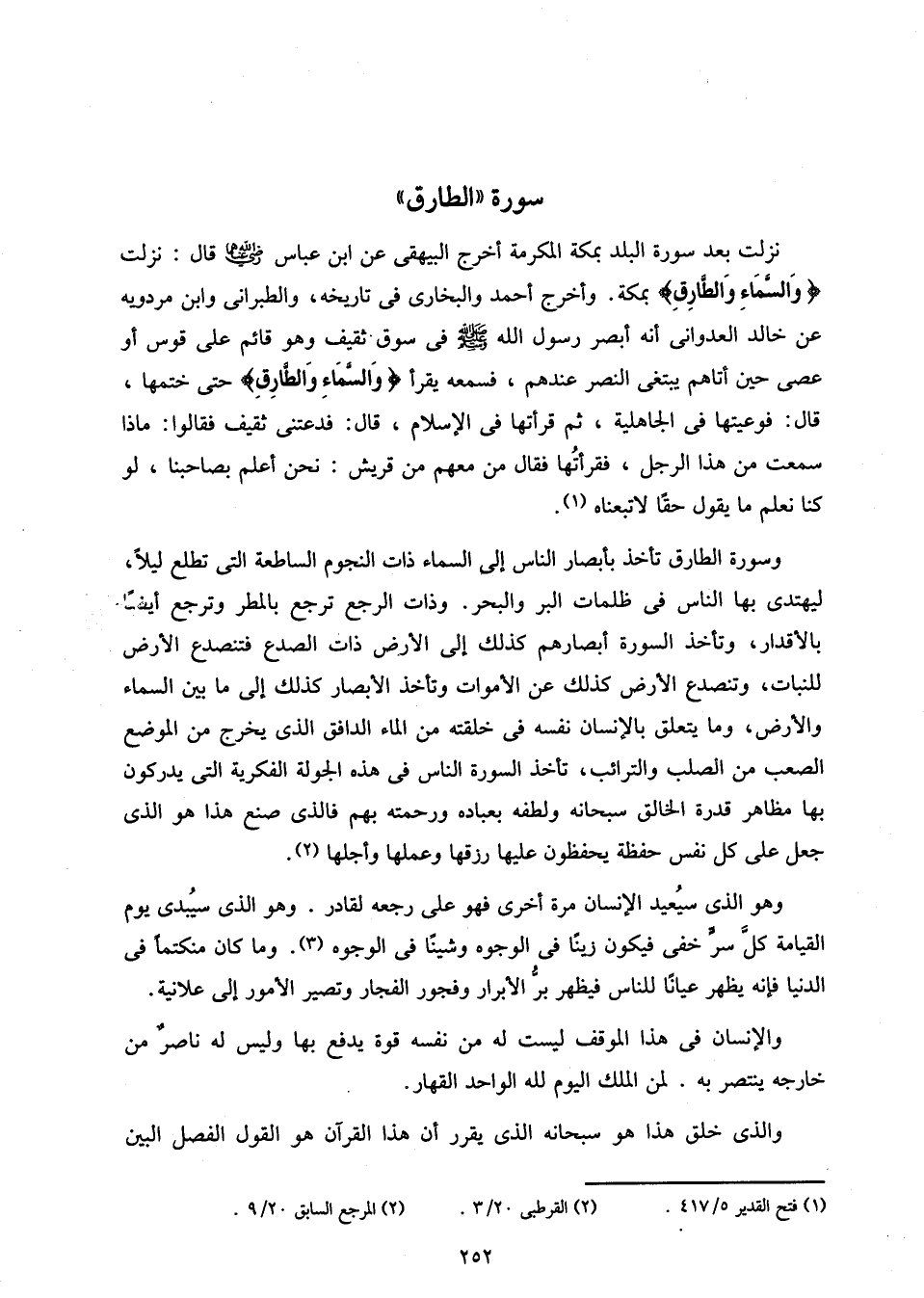 وسورة الطارق تأخذ بأبصار الناس إلى السماء ذات النجوم الساطعة التى تطلع ليلا، ليهتدى بها الناس فى ظلمات البر والبحر. وذات الرجع ترجع بالمطر وترجع أيضا بالأقدار، وتأخذ السورة أبصارهم كذلك إلى الأرض ذات الصدع فتنصدع الأرض للنبات، وتنصدع الأرض كذلك عن الأموات وتأخذ الأبصار كذلك إلى ما بين السماء والأرض، وما يتعلق بالإنسان نفسه فى خلقته من الماء الدافق الذى يخرج من الموضع الصعب من الصلب والترائب، تأخذ السورة الناس فى هذه الجولة الفكرية التى يدركون بها مظاهر قدرة الخالق سبحانه ولطفه بعباده ورحمته بهم فالذى صنع هذا هو الذى جعل على كل نفس حفظة يحفظون عليها رزقها وعملها وأجلها «2».