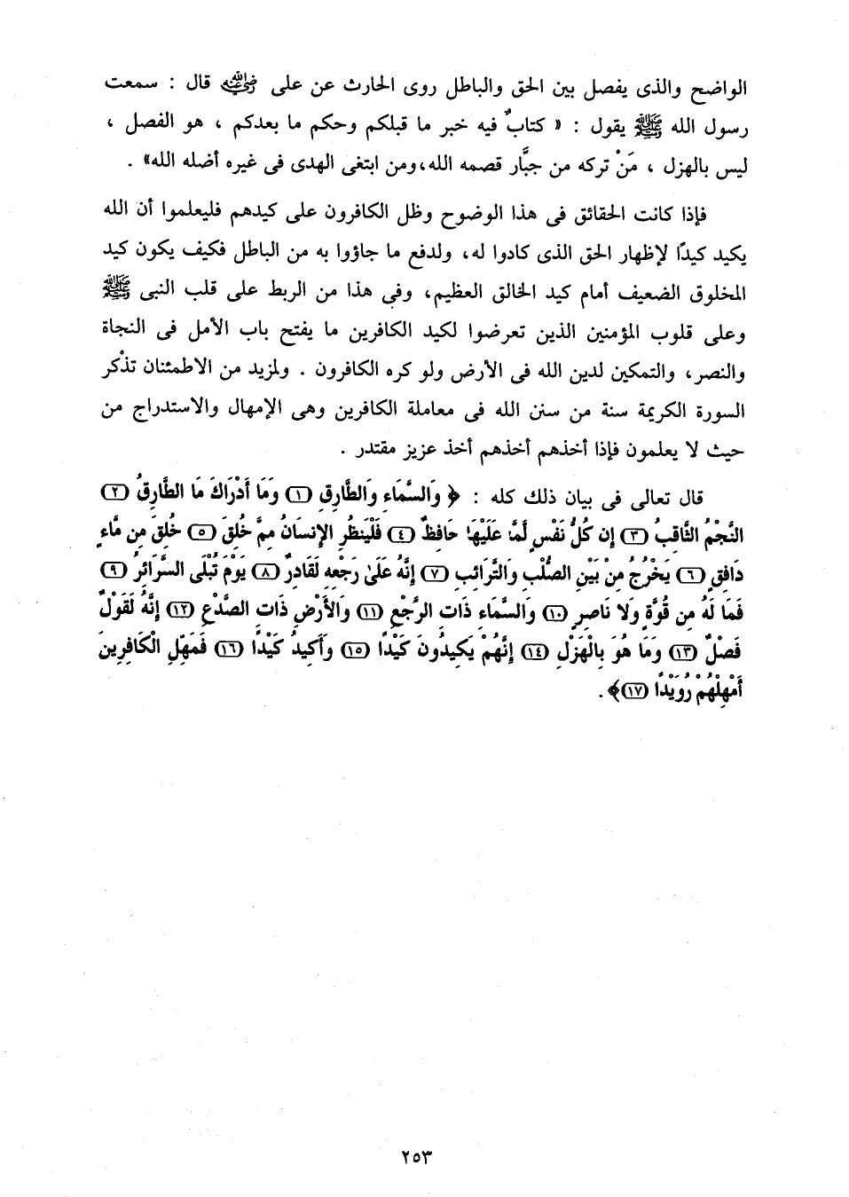 قال تعالى فى بيان ذلك كله: وَالسَّماءِ وَالطَّارِقِ (1) وَما أَدْراكَ مَا الطَّارِقُ (2) النَّجْمُ الثَّاقِبُ (3) إِنْ كُلُّ نَفْسٍ لَمَّا عَلَيْها حافِظٌ (4) فَلْيَنْظُرِ الْإِنْسانُ مِمَّ خُلِقَ (5) خُلِقَ مِنْ ماءٍ دافِقٍ (6) يَخْرُجُ مِنْ بَيْنِ الصُّلْبِ وَالتَّرائِبِ (7) إِنَّهُ عَلى رَجْعِهِ لَقادِرٌ (8) يَوْمَ تُبْلَى السَّرائِرُ (9) فَما لَهُ مِنْ قُوَّةٍ وَلا ناصِرٍ (10) وَالسَّماءِ ذاتِ الرَّجْعِ (11) وَالْأَرْضِ ذاتِ الصَّدْعِ (12) إِنَّهُ لَقَوْلٌ فَصْلٌ (13) وَما هُوَ بِالْهَزْلِ (14) إِنَّهُمْ يَكِيدُونَ كَيْداً (15) وَأَكِيدُ كَيْداً (16) فَمَهِّلِ الْكافِرِينَ أَمْهِلْهُمْ رُوَيْداً (17).