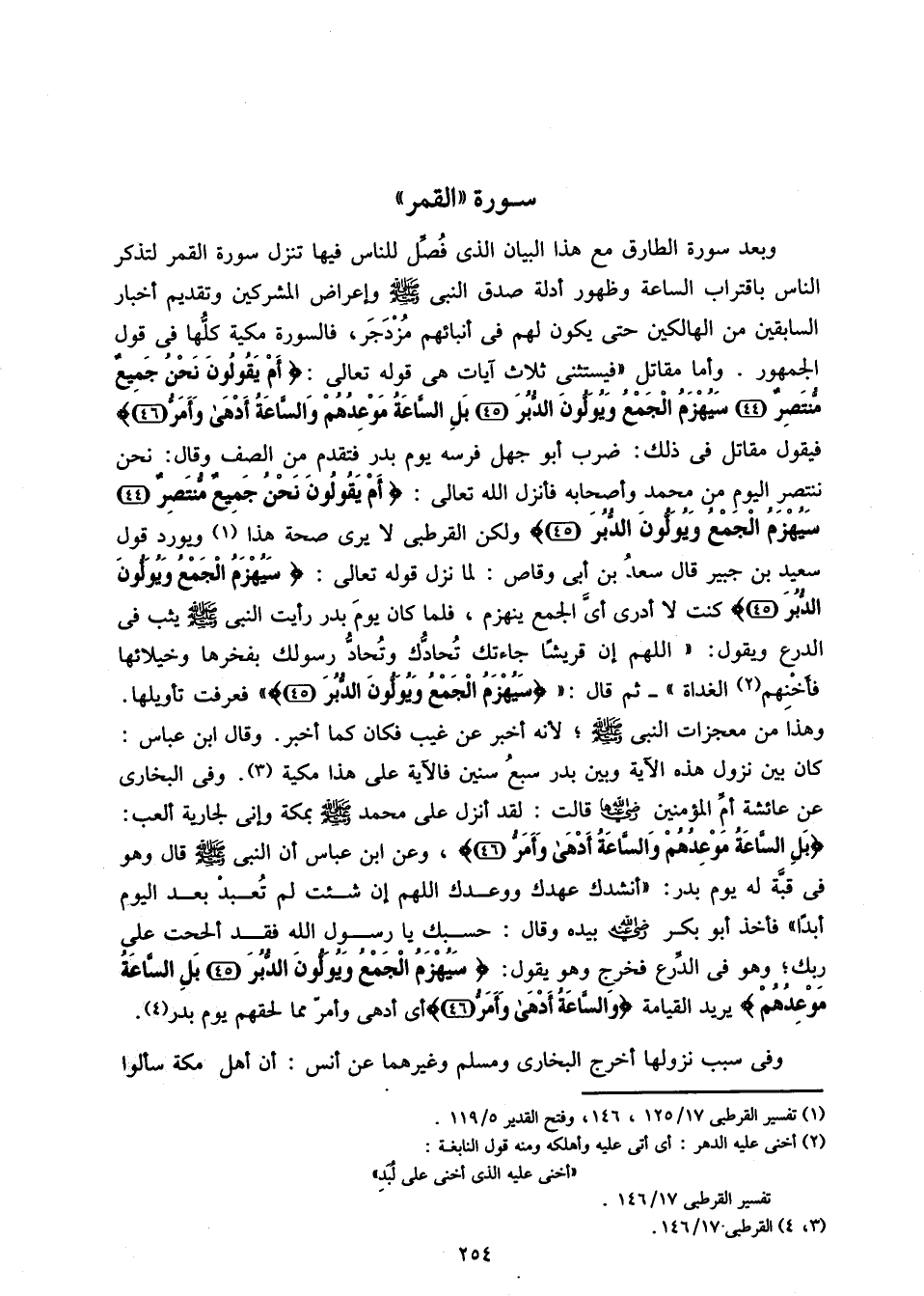 وبعد سورة الطارق مع هذا البيان الذى فصّل للناس فيها تنزل سورة القمر لتذكر الناس باقتراب الساعة وظهور أدلة صدق النبى صلّى الله عليه وسلم وإعراض المشركين وتقديم أخبار السابقين من الهالكين حتى يكون لهم فى أنبائهم مزدجر، فالسورة مكية كلّها فى قول الجمهور. وأما مقاتل «فيستثنى ثلاث آيات هى قوله تعالى: أَمْ يَقُولُونَ نَحْنُ جَمِيعٌ مُنْتَصِرٌ (44) سَيُهْزَمُ الْجَمْعُ وَيُوَلُّونَ الدُّبُرَ (45) بَلِ السَّاعَةُ مَوْعِدُهُمْ وَالسَّاعَةُ أَدْهى وَأَمَرُّ (46) فيقول مقاتل فى ذلك: ضرب أبو جهل فرسه يوم بدر فتقدم من الصف وقال: نحن ننتصر اليوم من محمد وأصحابه فأنزل الله تعالى: أَمْ يَقُولُونَ نَحْنُ جَمِيعٌ مُنْتَصِرٌ (44) سَيُهْزَمُ الْجَمْعُ وَيُوَلُّونَ الدُّبُرَ (45) ولكن القرطبى لا يرى صحة هذا «1» ويورد قول سعيد بن جبير قال سعد بن أبى وقاص: لما نزل قوله تعالى: سَيُهْزَمُ الْجَمْعُ وَيُوَلُّونَ الدُّبُرَ (45) كنت لا أدرى أىّ الجمع ينهزم، فلما كان يوم بدر رأيت النبى صلّى الله عليه وسلم يثب فى الدرع ويقول: «اللهم إن قريشا جاءتك تحادّك وتحادّ رسولك بفخرها وخيلائها فأخنهم «2» الغداة» - ثم قال: «سَيُهْزَمُ الْجَمْعُ وَيُوَلُّونَ الدُّبُرَ (45)» فعرفت تأويلها.
