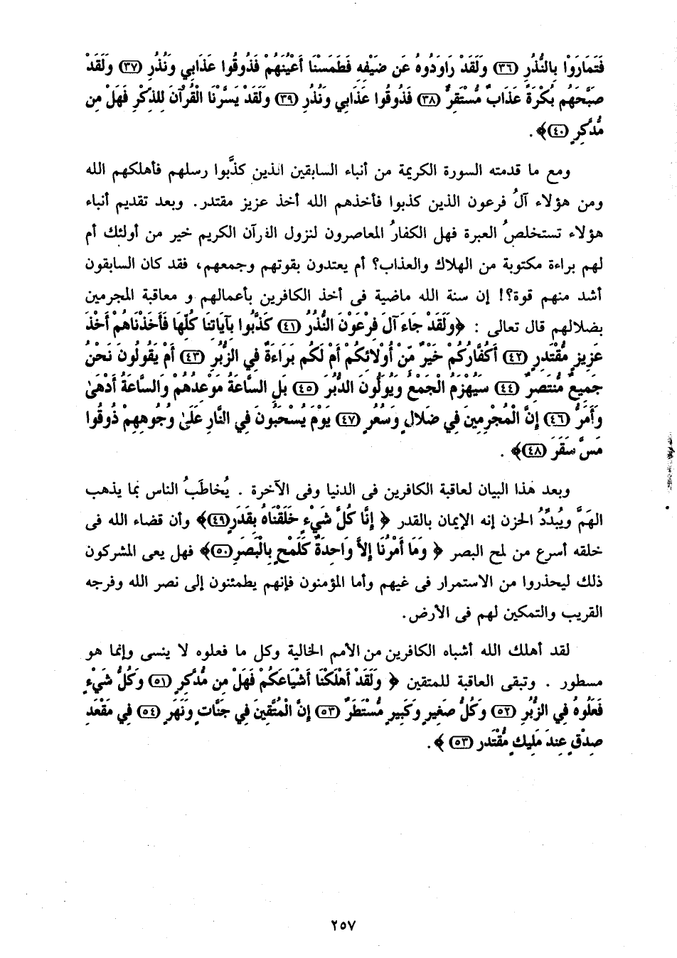 وبعد هذا البيان لعاقبة الكافرين فى الدنيا وفى الآخرة. يخاطب الناس بما يذهب الهمّ ويبدّد الحزن إنه الإيمان بالقدر إِنَّا كُلَّ شَيْءٍ خَلَقْناهُ بِقَدَرٍ (49) وأن قضاء الله فى خلقه أسرع من لمح البصر وَما أَمْرُنا إِلَّا واحِدَةٌ كَلَمْحٍ بِالْبَصَرِ (50) فهل يعى المشركون ذلك ليحذروا من الاستمرار فى غيهم وأما المؤمنون فإنهم يطمئنون إلى نصر الله وفرجه القريب والتمكين لهم فى الأرض.