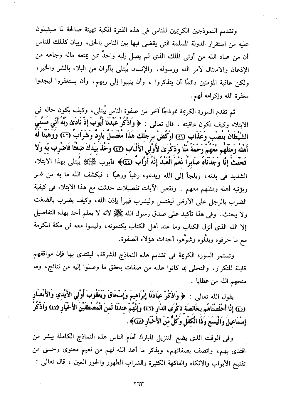 ثم تقدم السورة الكريمة نموذجا آخر من صفوة الناس يبتلى، وكيف يكون حاله فى الابتلاء وكيف تكون عاقبته، قال تعالى: وَاذْكُرْ عَبْدَنا أَيُّوبَ إِذْ نادى رَبَّهُ أَنِّي مَسَّنِيَ الشَّيْطانُ بِنُصْبٍ وَعَذابٍ (41) ارْكُضْ بِرِجْلِكَ هذا مُغْتَسَلٌ بارِدٌ وَشَرابٌ (42) وَوَهَبْنا لَهُ أَهْلَهُ وَمِثْلَهُمْ مَعَهُمْ رَحْمَةً مِنَّا وَذِكْرى لِأُولِي الْأَلْبابِ (43) وَخُذْ بِيَدِكَ ضِغْثاً فَاضْرِبْ بِهِ وَلا تَحْنَثْ إِنَّا وَجَدْناهُ صابِراً نِعْمَ الْعَبْدُ إِنَّهُ أَوَّابٌ (44) فأيوب عليه السّلام يبتلى بهذا الابتلاء الشديد فى بدنه، ويلجأ إلى الله ويدعوه رغبا ورهبا، فيكشف الله ما به من ضر ويؤتيه أهله ومثلهم معهم. وتقص الآيات تفصيلات حدثت مع هذا الابتلاء فى كيفية الضرب بالرجل على الأرض ليغتسل وليشرب فيبرأ بإذن الله، وكيف يضرب بالضغث ولا يحنث. وفى هذا تأكيد على صدق رسول الله صلّى الله عليه وسلم لأنه لا يعلم أحد بهذه التفاصيل إلا الله الذى أنزل الكتاب وما عند أهل الكتاب يكتمونه، وليسوا معه فى مكة المكرمة مع ما حرفوه وبدّلوه وشوّهوا أحداث هؤلاء الصفوة.