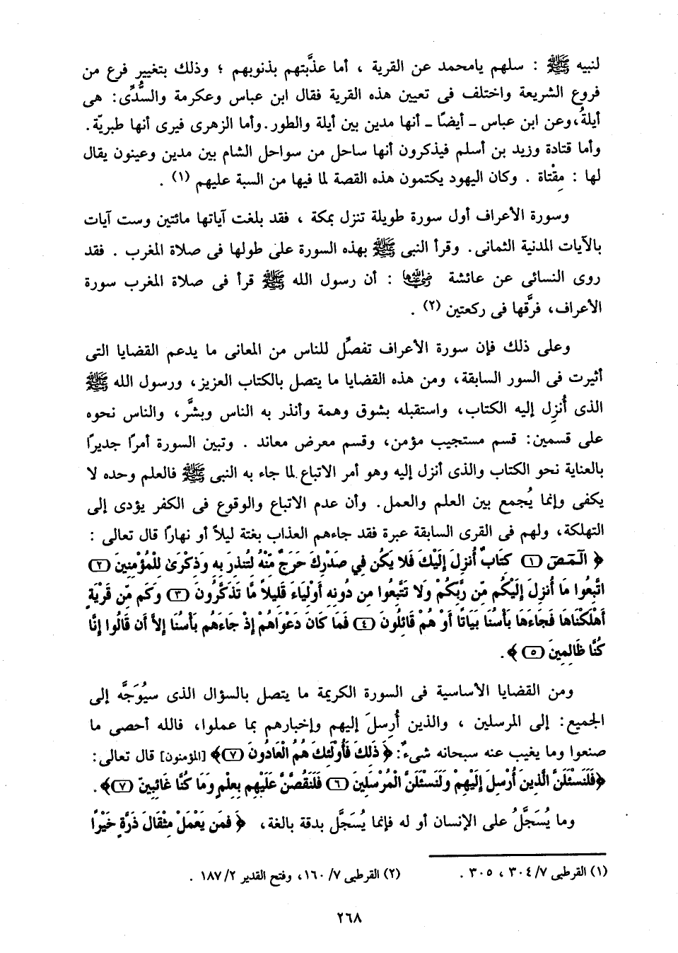 المص (1) كِتابٌ أُنْزِلَ إِلَيْكَ فَلا يَكُنْ فِي صَدْرِكَ حَرَجٌ مِنْهُ لِتُنْذِرَ بِهِ وَذِكْرى لِلْمُؤْمِنِينَ (2) اتَّبِعُوا ما أُنْزِلَ إِلَيْكُمْ مِنْ رَبِّكُمْ وَلا تَتَّبِعُوا مِنْ دُونِهِ أَوْلِياءَ قَلِيلًا ما تَذَكَّرُونَ (3) وَكَمْ مِنْ قَرْيَةٍ أَهْلَكْناها فَجاءَها بَأْسُنا بَياتاً أَوْ هُمْ قائِلُونَ (4) فَما كانَ دَعْواهُمْ إِذْ جاءَهُمْ بَأْسُنا إِلَّا أَنْ قالُوا إِنَّا كُنَّا ظالِمِينَ (5).