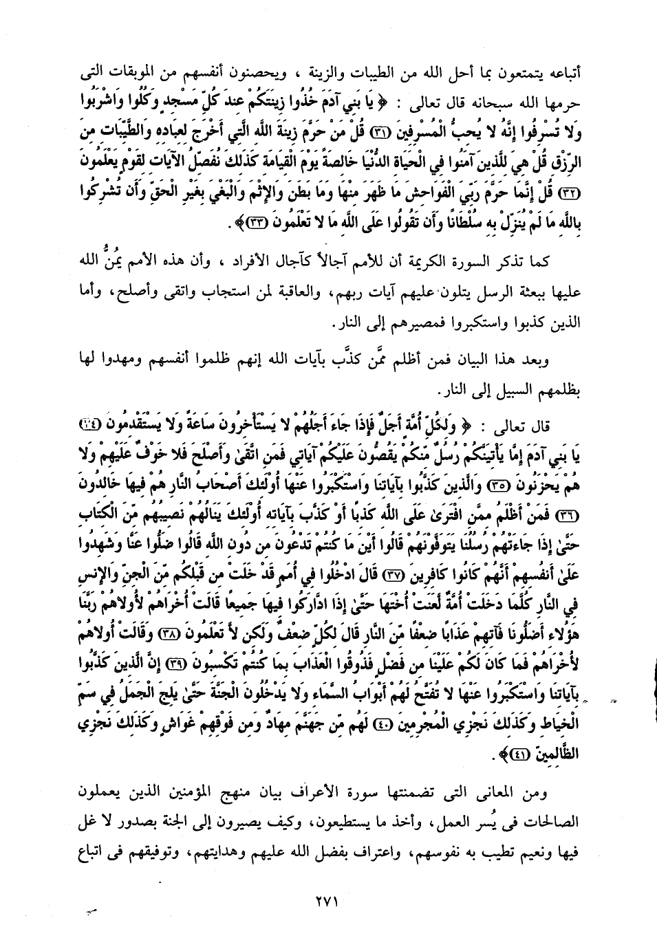 قال تعالى: وَلِكُلِّ أُمَّةٍ أَجَلٌ فَإِذا جاءَ أَجَلُهُمْ لا يَسْتَأْخِرُونَ ساعَةً وَلا يَسْتَقْدِمُونَ (34) يا بَنِي آدَمَ إِمَّا يَأْتِيَنَّكُمْ رُسُلٌ مِنْكُمْ يَقُصُّونَ عَلَيْكُمْ آياتِي فَمَنِ اتَّقى وَأَصْلَحَ فَلا خَوْفٌ عَلَيْهِمْ وَلا هُمْ يَحْزَنُونَ (35) وَالَّذِينَ كَذَّبُوا بِآياتِنا وَاسْتَكْبَرُوا عَنْها أُولئِكَ أَصْحابُ النَّارِ هُمْ فِيها خالِدُونَ (36) فَمَنْ أَظْلَمُ مِمَّنِ افْتَرى عَلَى اللَّهِ كَذِباً أَوْ كَذَّبَ بِآياتِهِ أُولئِكَ يَنالُهُمْ نَصِيبُهُمْ مِنَ الْكِتابِ حَتَّى إِذا جاءَتْهُمْ رُسُلُنا يَتَوَفَّوْنَهُمْ قالُوا أَيْنَ ما كُنْتُمْ تَدْعُونَ مِنْ دُونِ اللَّهِ قالُوا ضَلُّوا عَنَّا وَشَهِدُوا عَلى أَنْفُسِهِمْ أَنَّهُمْ كانُوا كافِرِينَ (37) قالَ ادْخُلُوا فِي أُمَمٍ قَدْ خَلَتْ مِنْ قَبْلِكُمْ مِنَ الْجِنِّ وَالْإِنْسِ فِي النَّارِ كُلَّما دَخَلَتْ أُمَّةٌ لَعَنَتْ أُخْتَها حَتَّى إِذَا ادَّارَكُوا فِيها جَمِيعاً قالَتْ أُخْراهُمْ لِأُولاهُمْ رَبَّنا هؤُلاءِ أَضَلُّونا فَآتِهِمْ عَذاباً ضِعْفاً مِنَ النَّارِ قالَ لِكُلٍّ ضِعْفٌ وَلكِنْ لا تَعْلَمُونَ (38) وَقالَتْ أُولاهُمْ لِأُخْراهُمْ فَما كانَ لَكُمْ عَلَيْنا مِنْ فَضْلٍ فَذُوقُوا الْعَذابَ بِما كُنْتُمْ تَكْسِبُونَ (39) إِنَّ الَّذِينَ كَذَّبُوا بِآياتِنا وَاسْتَكْبَرُوا عَنْها لا تُفَتَّحُ لَهُمْ أَبْوابُ السَّماءِ وَلا يَدْخُلُونَ الْجَنَّةَ حَتَّى يَلِجَ الْجَمَلُ فِي سَمِّ الْخِياطِ وَكَذلِكَ نَجْزِي الْمُجْرِمِينَ (40) لَهُمْ مِنْ جَهَنَّمَ مِهادٌ وَمِنْ فَوْقِهِمْ غَواشٍ وَكَذلِكَ نَجْزِي الظَّالِمِينَ (41).