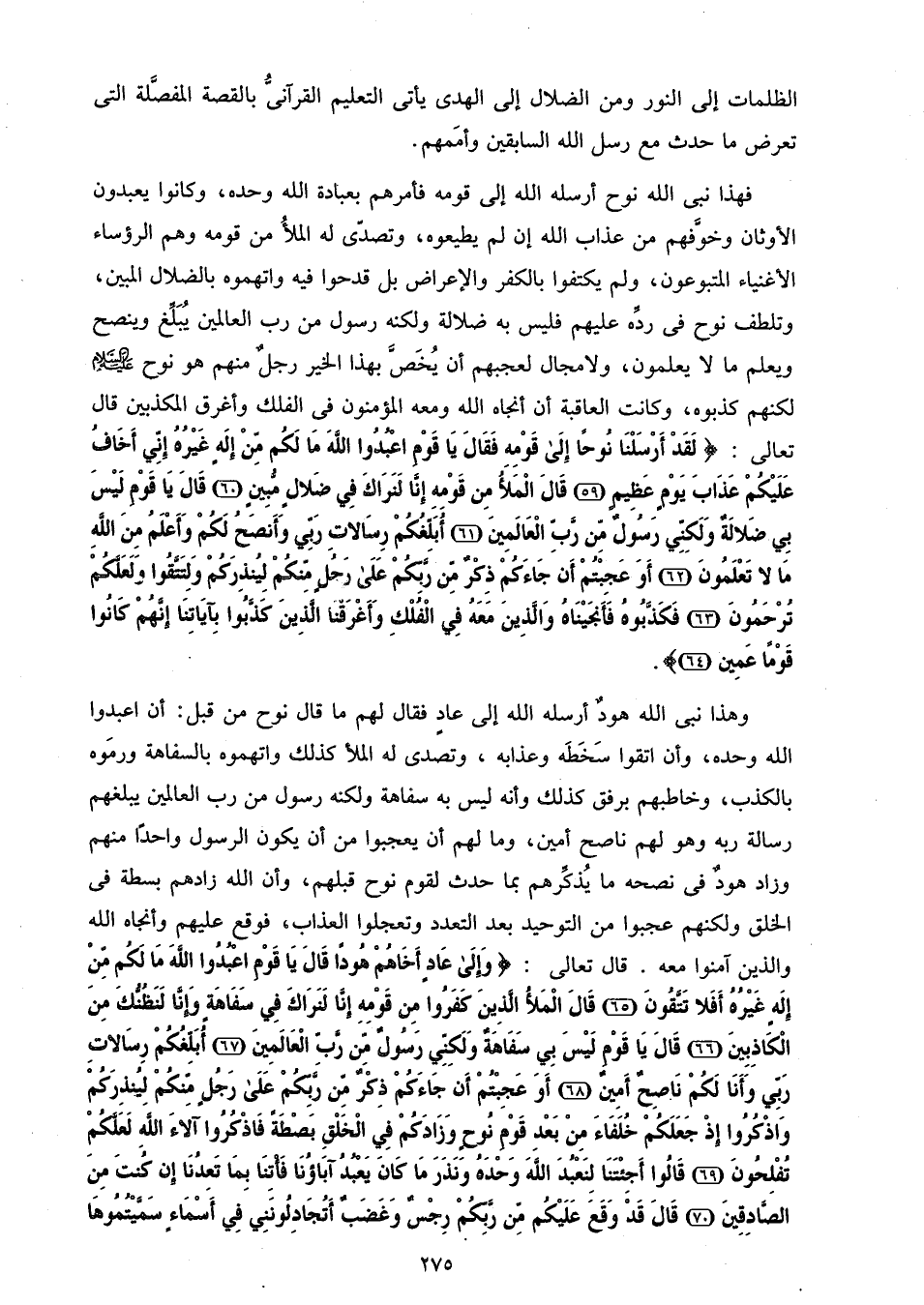 فهذا نبى الله نوح أرسله الله إلى قومه فأمرهم بعبادة الله وحده، وكانوا يعبدون الأوثان وخوّفهم من عذاب الله إن لم يطيعوه، وتصدّى له الملأ من قومه وهم الرؤساء الأغنياء المتبوعون، ولم يكتفوا بالكفر والإعراض بل قدحوا فيه واتهموه بالضلال المبين، وتلطف نوح فى ردّه عليهم فليس به ضلالة ولكنه رسول من رب العالمين يبلّغ وينصح ويعلم ما لا يعلمون، ولا مجال لعجبهم أن يخصّ بهذا الخير رجل منهم هو نوح عليه السّلام لكنهم كذبوه، وكانت العاقبة أن أنجاه الله ومعه المؤمنون فى الفلك وأغرق المكذبين قال تعالى: لَقَدْ أَرْسَلْنا نُوحاً إِلى قَوْمِهِ فَقالَ يا قَوْمِ اعْبُدُوا اللَّهَ ما لَكُمْ مِنْ إِلهٍ غَيْرُهُ إِنِّي أَخافُ عَلَيْكُمْ عَذابَ يَوْمٍ عَظِيمٍ (59) قالَ الْمَلَأُ مِنْ قَوْمِهِ إِنَّا لَنَراكَ فِي ضَلالٍ مُبِينٍ (60) قالَ يا قَوْمِ لَيْسَ بِي ضَلالَةٌ وَلكِنِّي رَسُولٌ مِنْ رَبِّ الْعالَمِينَ (61) أُبَلِّغُكُمْ رِسالاتِ رَبِّي وَأَنْصَحُ لَكُمْ وَأَعْلَمُ مِنَ اللَّهِ ما لا تَعْلَمُونَ (62) أَوَعَجِبْتُمْ أَنْ جاءَكُمْ ذِكْرٌ مِنْ رَبِّكُمْ عَلى رَجُلٍ مِنْكُمْ لِيُنْذِرَكُمْ وَلِتَتَّقُوا وَلَعَلَّكُمْ تُرْحَمُونَ (63) فَكَذَّبُوهُ فَأَنْجَيْناهُ وَالَّذِينَ مَعَهُ فِي الْفُلْكِ وَأَغْرَقْنَا الَّذِينَ كَذَّبُوا بِآياتِنا إِنَّهُمْ كانُوا قَوْماً عَمِينَ (64).