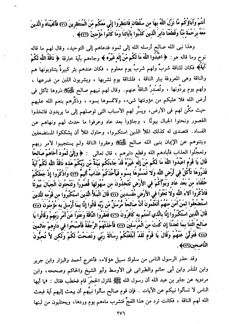 وهذا نبى الله صالح أرسله الله إلى ثمود فدعاهم إلى التوحيد، وقال لهم ما قاله نوح وما قاله هو: اعْبُدُوا اللَّهَ ما لَكُمْ مِنْ إِلهٍ غَيْرُهُ وجاءهم بآية خارقة ناقَةُ اللَّهِ لَكُمْ آيَةً فكان للناقة شرب ولهم شرب يوم معلوم، فكان عندهم بئر كبيرة يتناوبونها هم والناقة وهى المعروفة ببئر الناقة، فللناقة يوم تشربها، ويشربون اللبن من ضرعها، ولهم يوم يردونها، وتصدر الناقة عنهم. وقال لهم نبيهم صالح عليه السّلام ذروها تأكل فى أرض الله فلا عليكم من مئونتها شىء، ولا تمسوها بسوء، وذكّرهم بنعم الله عليهم حيث مكّن لهم فى الأرض، ويسّر لهم الأسباب التى توصلهم إلى ما يريدون فاتخذوا القصور ونحتوا الجبال بيوتا، وجاءوا بعد عاد وعرفوا ما حدث لهم ونهاهم عن الفساد. فتصدى له كذلك الملأ الذين استكبروا، وحاول الملأ أن يشككوا المستضعفين ويتنوهم عن الإيمان بنبى الله صالح عليه السّلام وعقروا الناقة ولم يستجيبوا لأمر ربهم وتعجّلوا العذاب فأبادهم الله وقطع دابرهم، قال تعالى: وَإِلى ثَمُودَ أَخاهُمْ صالِحاً قالَ يا قَوْمِ اعْبُدُوا اللَّهَ ما لَكُمْ مِنْ إِلهٍ غَيْرُهُ قَدْ جاءَتْكُمْ بَيِّنَةٌ مِنْ رَبِّكُمْ هذِهِ ناقَةُ اللَّهِ لَكُمْ آيَةً فَذَرُوها تَأْكُلْ فِي أَرْضِ اللَّهِ وَلا تَمَسُّوها بِسُوءٍ فَيَأْخُذَكُمْ عَذابٌ أَلِيمٌ (73) وَاذْكُرُوا إِذْ جَعَلَكُمْ خُلَفاءَ مِنْ بَعْدِ عادٍ وَبَوَّأَكُمْ فِي الْأَرْضِ تَتَّخِذُونَ مِنْ سُهُولِها قُصُوراً وَتَنْحِتُونَ الْجِبالَ بُيُوتاً فَاذْكُرُوا آلاءَ اللَّهِ وَلا تَعْثَوْا فِي الْأَرْضِ مُفْسِدِينَ (74) قالَ الْمَلَأُ الَّذِينَ اسْتَكْبَرُوا مِنْ قَوْمِهِ لِلَّذِينَ اسْتُضْعِفُوا لِمَنْ آمَنَ مِنْهُمْ أَتَعْلَمُونَ أَنَّ صالِحاً مُرْسَلٌ مِنْ رَبِّهِ قالُوا إِنَّا بِما أُرْسِلَ بِهِ مُؤْمِنُونَ (75) قالَ الَّذِينَ اسْتَكْبَرُوا إِنَّا بِالَّذِي آمَنْتُمْ بِهِ كافِرُونَ (76) فَعَقَرُوا النَّاقَةَ وَعَتَوْا عَنْ أَمْرِ رَبِّهِمْ وَقالُوا يا صالِحُ ائْتِنا بِما تَعِدُنا إِنْ كُنْتَ مِنَ الْمُرْسَلِينَ (77) فَأَخَذَتْهُمُ الرَّجْفَةُ فَأَصْبَحُوا فِي دارِهِمْ جاثِمِينَ (78) فَتَوَلَّى عَنْهُمْ وَقالَ يا قَوْمِ لَقَدْ أَبْلَغْتُكُمْ رِسالَةَ رَبِّي وَنَصَحْتُ لَكُمْ وَلكِنْ لا تُحِبُّونَ النَّاصِحِينَ (79).
