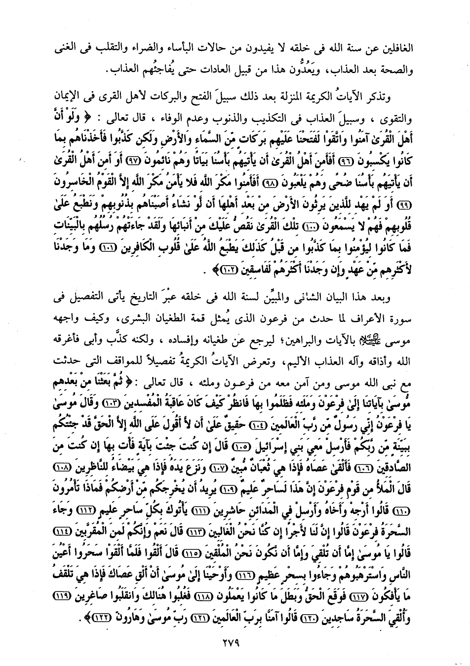 وبعد هذا البيان الشافى والمبيّن لسنة الله فى خلقه عبر التاريخ يأتى التفصيل فى سورة الأعراف لما حدث من فرعون الذى يمثل قمة الطغيان البشرى، وكيف واجهه موسى عليه السّلام بالآيات والبراهين؛ ليرجع عن طغيانه وإفساده، ولكنه كذّب وأبى فأغرقه الله وأذاقه وآله العذاب الأليم، وتعرض الآيات الكريمة تفصيلا للمواقف التى حدثت مع نبى الله موسى ومن آمن معه من فرعون وملئه، قال تعالى: ثُمَّ بَعَثْنا مِنْ بَعْدِهِمْ مُوسى بِآياتِنا إِلى فِرْعَوْنَ وَمَلَائِهِ فَظَلَمُوا بِها فَانْظُرْ كَيْفَ كانَ عاقِبَةُ الْمُفْسِدِينَ (103) وَقالَ مُوسى يا فِرْعَوْنُ إِنِّي رَسُولٌ مِنْ رَبِّ الْعالَمِينَ (104) حَقِيقٌ عَلى أَنْ لا أَقُولَ عَلَى اللَّهِ إِلَّا الْحَقَّ قَدْ جِئْتُكُمْ بِبَيِّنَةٍ مِنْ رَبِّكُمْ فَأَرْسِلْ مَعِيَ بَنِي إِسْرائِيلَ (105) قالَ إِنْ كُنْتَ جِئْتَ بِآيَةٍ فَأْتِ بِها إِنْ كُنْتَ مِنَ الصَّادِقِينَ (106) فَأَلْقى عَصاهُ فَإِذا هِيَ ثُعْبانٌ مُبِينٌ (107) وَنَزَعَ يَدَهُ فَإِذا هِيَ بَيْضاءُ لِلنَّاظِرِينَ (108) قالَ الْمَلَأُ مِنْ قَوْمِ فِرْعَوْنَ إِنَّ هذا لَساحِرٌ عَلِيمٌ (109) يُرِيدُ أَنْ يُخْرِجَكُمْ مِنْ أَرْضِكُمْ فَماذا تَأْمُرُونَ (110) قالُوا أَرْجِهْ وَأَخاهُ وَأَرْسِلْ فِي الْمَدائِنِ حاشِرِينَ (111) يَأْتُوكَ بِكُلِّ ساحِرٍ عَلِيمٍ (112) وَجاءَ السَّحَرَةُ فِرْعَوْنَ قالُوا إِنَّ لَنا لَأَجْراً إِنْ كُنَّا نَحْنُ الْغالِبِينَ (113) قالَ نَعَمْ وَإِنَّكُمْ لَمِنَ الْمُقَرَّبِينَ (114) قالُوا يا مُوسى إِمَّا أَنْ تُلْقِيَ وَإِمَّا أَنْ نَكُونَ نَحْنُ الْمُلْقِينَ (115) قالَ أَلْقُوا فَلَمَّا أَلْقَوْا سَحَرُوا أَعْيُنَ النَّاسِ وَاسْتَرْهَبُوهُمْ وَجاؤُ بِسِحْرٍ عَظِيمٍ (116) وَأَوْحَيْنا إِلى مُوسى أَنْ أَلْقِ عَصاكَ فَإِذا هِيَ تَلْقَفُ ما يَأْفِكُونَ (117) فَوَقَعَ الْحَقُّ وَبَطَلَ ما كانُوا يَعْمَلُونَ (118) فَغُلِبُوا هُنالِكَ وَانْقَلَبُوا صاغِرِينَ (119) وَأُلْقِيَ السَّحَرَةُ ساجِدِينَ (120) قالُوا آمَنَّا بِرَبِّ الْعالَمِينَ (121) رَبِّ مُوسى وَهارُونَ (122).