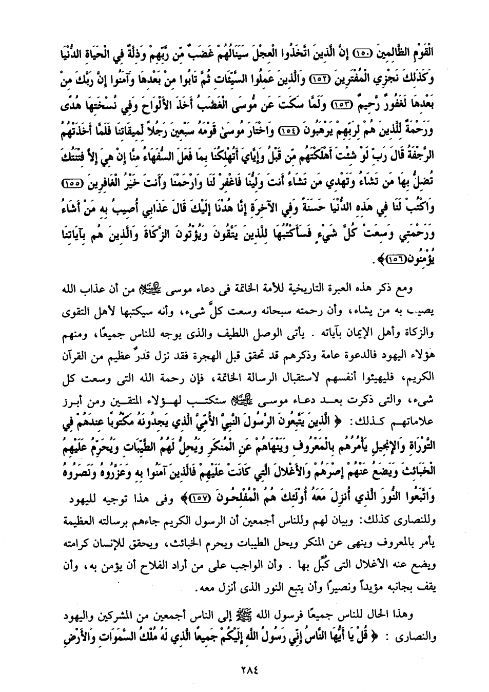 الْقَوْمِ الظَّالِمِينَ (150) إِنَّ الَّذِينَ اتَّخَذُوا الْعِجْلَ سَيَنالُهُمْ غَضَبٌ مِنْ رَبِّهِمْ وَذِلَّةٌ فِي الْحَياةِ الدُّنْيا وَكَذلِكَ نَجْزِي الْمُفْتَرِينَ (152) وَالَّذِينَ عَمِلُوا السَّيِّئاتِ ثُمَّ تابُوا مِنْ بَعْدِها وَآمَنُوا إِنَّ رَبَّكَ مِنْ بَعْدِها لَغَفُورٌ رَحِيمٌ (153) وَلَمَّا سَكَتَ عَنْ مُوسَى الْغَضَبُ أَخَذَ الْأَلْواحَ وَفِي نُسْخَتِها هُدىً وَرَحْمَةٌ لِلَّذِينَ هُمْ لِرَبِّهِمْ يَرْهَبُونَ (154) وَاخْتارَ مُوسى قَوْمَهُ سَبْعِينَ رَجُلًا لِمِيقاتِنا فَلَمَّا أَخَذَتْهُمُ الرَّجْفَةُ قالَ رَبِّ لَوْ شِئْتَ أَهْلَكْتَهُمْ مِنْ قَبْلُ وَإِيَّايَ أَتُهْلِكُنا بِما فَعَلَ السُّفَهاءُ مِنَّا إِنْ هِيَ إِلَّا فِتْنَتُكَ تُضِلُّ بِها مَنْ تَشاءُ وَتَهْدِي مَنْ تَشاءُ أَنْتَ وَلِيُّنا فَاغْفِرْ لَنا وَارْحَمْنا وَأَنْتَ خَيْرُ الْغافِرِينَ (155) وَاكْتُبْ لَنا فِي هذِهِ الدُّنْيا حَسَنَةً وَفِي الْآخِرَةِ إِنَّا هُدْنا إِلَيْكَ قالَ عَذابِي أُصِيبُ بِهِ مَنْ أَشاءُ وَرَحْمَتِي وَسِعَتْ كُلَّ شَيْءٍ