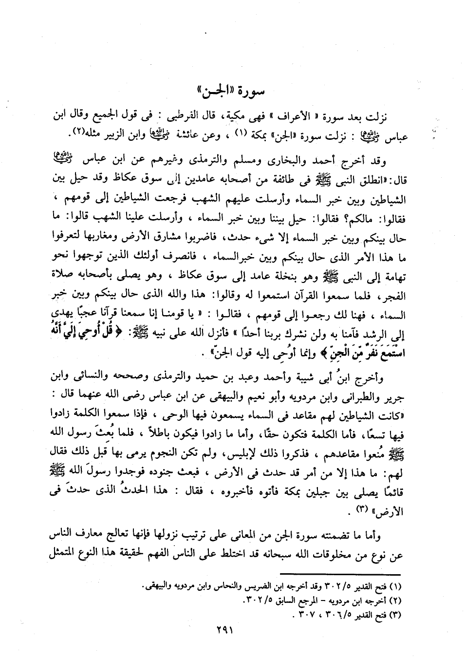 وقد أخرج أحمد والبخارى ومسلم والترمذى وغيرهم عن ابن عباس رضي الله عنهما قال: «انطلق النبى صلّى الله عليه وسلم فى طائفة من أصحابه عامدين إلى سوق عكاظ وقد حيل بين الشياطين وبين خبر السماء وأرسلت عليهم الشهب فرجعت الشياطين إلى قومهم، فقالوا: ما لكم؟ فقالوا: حيل بيننا وبين خبر السماء، وأرسلت علينا الشهب قالوا: ما حال بينكم وبين خبر السماء إلا شىء حدث، فاضربوا مشارق الأرض ومغاربها لتعرفوا ما هذا الأمر الذى حال بينكم وبين خبر السماء، فانصرف أولئك الذين توجهوا نحو تهامة إلى النبى صلّى الله عليه وسلم وهو بنخلة عامد إلى سوق عكاظ، وهو يصلى بأصحابه صلاة الفجر، فلما سمعوا القرآن استمعوا له وقالوا: هذا والله الذى حال بينكم وبين خبر السماء، فهنا لك رجعوا إلى قومهم، فقالوا: «يا قومنا إنا سمعنا قرآنا عجبا يهدى إلى الرشد فآمنا به ولن نشرك بربنا أحدا» فأنزل الله على نبيه صلّى الله عليه وسلم: قُلْ أُوحِيَ إِلَيَّ أَنَّهُ اسْتَمَعَ نَفَرٌ مِنَ الْجِنِّ وإنما أوحى إليه قول الجنّ».