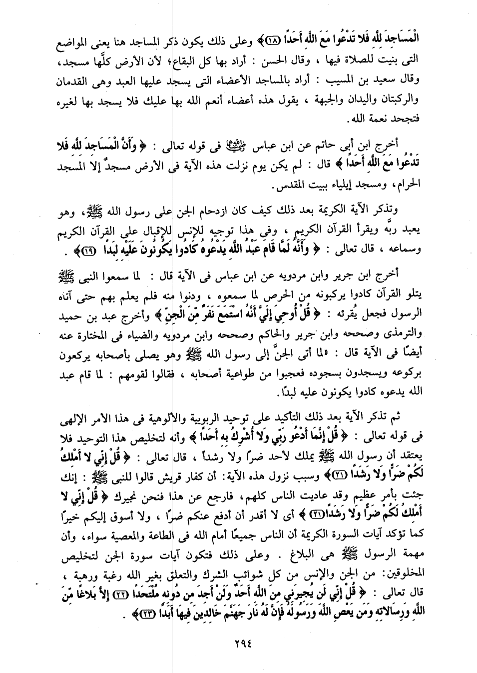 ثم تذكر الآية بعد ذلك التأكيد على توحيد الربوبية والألوهية فى هذا الأمر الإلهى فى قوله تعالى: قُلْ إِنَّما أَدْعُوا رَبِّي وَلا أُشْرِكُ بِهِ أَحَداً وأنه لتخليص هذا التوحيد فلا يعتقد أن رسول الله صلّى الله عليه وسلم يملك لأحد ضرا ولا رشدا، قال تعالى: قُلْ إِنِّي لا أَمْلِكُ لَكُمْ ضَرًّا وَلا رَشَداً (21) وسبب نزول هذه الآية: أن كفار قريش قالوا للنبى صلّى الله عليه وسلم: إنك جئت بأمر عظيم وقد عاديت الناس كلهم، فارجع عن هذ فنحن نجيرك قُلْ إِنِّي لا أَمْلِكُ لَكُمْ ضَرًّا وَلا رَشَداً (21) أى لا أقدر أن أدفع عنكم ضرا، ولا أسوق إليكم خيرا كما تؤكد آيات السورة الكريمة أن الناس جميعا أمام الله فى الطاعة والمعصية سواء، وأن مهمة الرسول صلّى الله عليه وسلم هى البلاغ. وعلى ذلك فتكون آيات سورة الجن لتخليص المخلوقين: من الجن والإنس من كل شوائب الشرك والتعلق بغير الله رغبة ورهبة، قال تعالى: قُلْ إِنِّي لَنْ يُجِيرَنِي مِنَ اللَّهِ أَحَدٌ وَلَنْ أَجِدَ مِنْ دُونِهِ مُلْتَحَداً (22) إِلَّا بَلاغاً مِنَ اللَّهِ وَرِسالاتِهِ وَمَنْ يَعْصِ اللَّهَ وَرَسُولَهُ فَإِنَّ لَهُ نارَ جَهَنَّمَ خالِدِينَ فِيها أَبَداً (23).