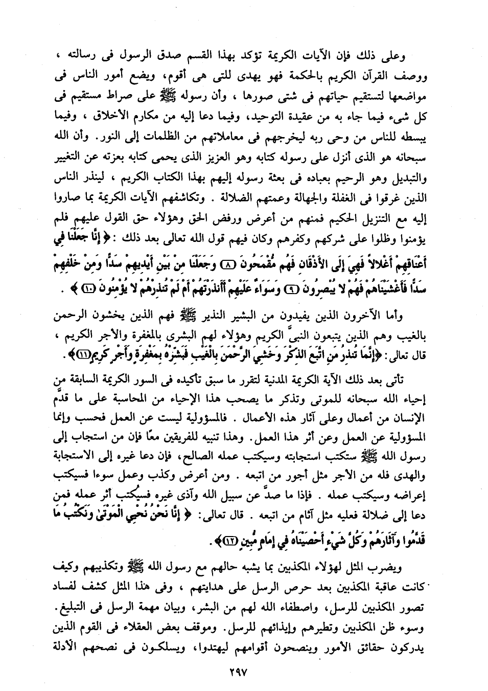 وعلى ذلك فإن الآيات الكريمة تؤكد بهذا القسم صدق الرسول فى رسالته، ووصف القرآن الكريم بالحكمة فهو يهدى للتى هى أقوم، ويضع أمور الناس فى مواضعها لتستقيم حياتهم فى شتى صورها، وأن رسوله صلّى الله عليه وسلّم على صراط مستقيم فى كل شىء فيما جاء به من عقيدة التوحيد، وفيما دعا إليه من مكارم الأخلاق، وفيما يبسطه للناس من وحى ربه ليخرجهم فى معاملاتهم من الظلمات إلى النور. وأن الله سبحانه هو الذى أنزل على رسوله كتابه وهو العزيز الذى يحمى كتابه بعزته عن التغيير والتبديل وهو الرحيم بعباده فى بعثة رسوله إليهم بهذا الكتاب الكريم، لينذر الناس الذين غرقوا فى الغفلة والجهالة وعمتهم الضلالة. وتكاشفهم الآيات الكريمة بما صاروا إليه مع التنزيل الحكيم فمنهم من أعرض ورفض الحق وهؤلاء حق القول عليهم فلم يؤمنوا وظلوا على شركهم وكفرهم وكان فيهم قول الله تعالى بعد ذلك: إِنَّا جَعَلْنا فِي أَعْناقِهِمْ أَغْلالًا فَهِيَ إِلَى الْأَذْقانِ فَهُمْ مُقْمَحُونَ (8) وَجَعَلْنا مِنْ بَيْنِ أَيْدِيهِمْ سَدًّا وَمِنْ خَلْفِهِمْ سَدًّا فَأَغْشَيْناهُمْ فَهُمْ لا يُبْصِرُونَ (9) وَسَواءٌ عَلَيْهِمْ أَأَنْذَرْتَهُمْ أَمْ لَمْ تُنْذِرْهُمْ لا يُؤْمِنُونَ (10).
