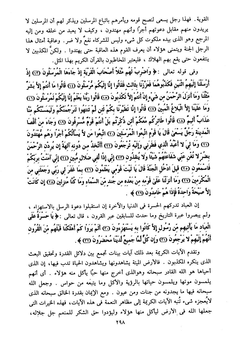 وفى قوله تعالى: وَاضْرِبْ لَهُمْ مَثَلًا أَصْحابَ الْقَرْيَةِ إِذْ جاءَهَا الْمُرْسَلُونَ (13) إِذْ أَرْسَلْنا إِلَيْهِمُ اثْنَيْنِ فَكَذَّبُوهُما فَعَزَّزْنا بِثالِثٍ فَقالُوا إِنَّا إِلَيْكُمْ مُرْسَلُونَ (14) قالُوا ما أَنْتُمْ إِلَّا بَشَرٌ مِثْلُنا وَما أَنْزَلَ الرَّحْمنُ مِنْ شَيْءٍ إِنْ أَنْتُمْ إِلَّا تَكْذِبُونَ (15) قالُوا رَبُّنا يَعْلَمُ إِنَّا إِلَيْكُمْ لَمُرْسَلُونَ (16) وَما عَلَيْنا إِلَّا الْبَلاغُ الْمُبِينُ (17) قالُوا إِنَّا تَطَيَّرْنا بِكُمْ لَئِنْ لَمْ تَنْتَهُوا لَنَرْجُمَنَّكُمْ وَلَيَمَسَّنَّكُمْ مِنَّا عَذابٌ أَلِيمٌ (18) قالُوا طائِرُكُمْ مَعَكُمْ أَإِنْ ذُكِّرْتُمْ بَلْ أَنْتُمْ قَوْمٌ مُسْرِفُونَ (19) وَجاءَ مِنْ أَقْصَا الْمَدِينَةِ رَجُلٌ يَسْعى قالَ يا قَوْمِ اتَّبِعُوا الْمُرْسَلِينَ (20) اتَّبِعُوا مَنْ لا يَسْئَلُكُمْ أَجْراً وَهُمْ مُهْتَدُونَ (21) وَما لِيَ لا أَعْبُدُ الَّذِي فَطَرَنِي وَإِلَيْهِ تُرْجَعُونَ (22) أَأَتَّخِذُ مِنْ دُونِهِ آلِهَةً إِنْ يُرِدْنِ الرَّحْمنُ بِضُرٍّ لا تُغْنِ عَنِّي