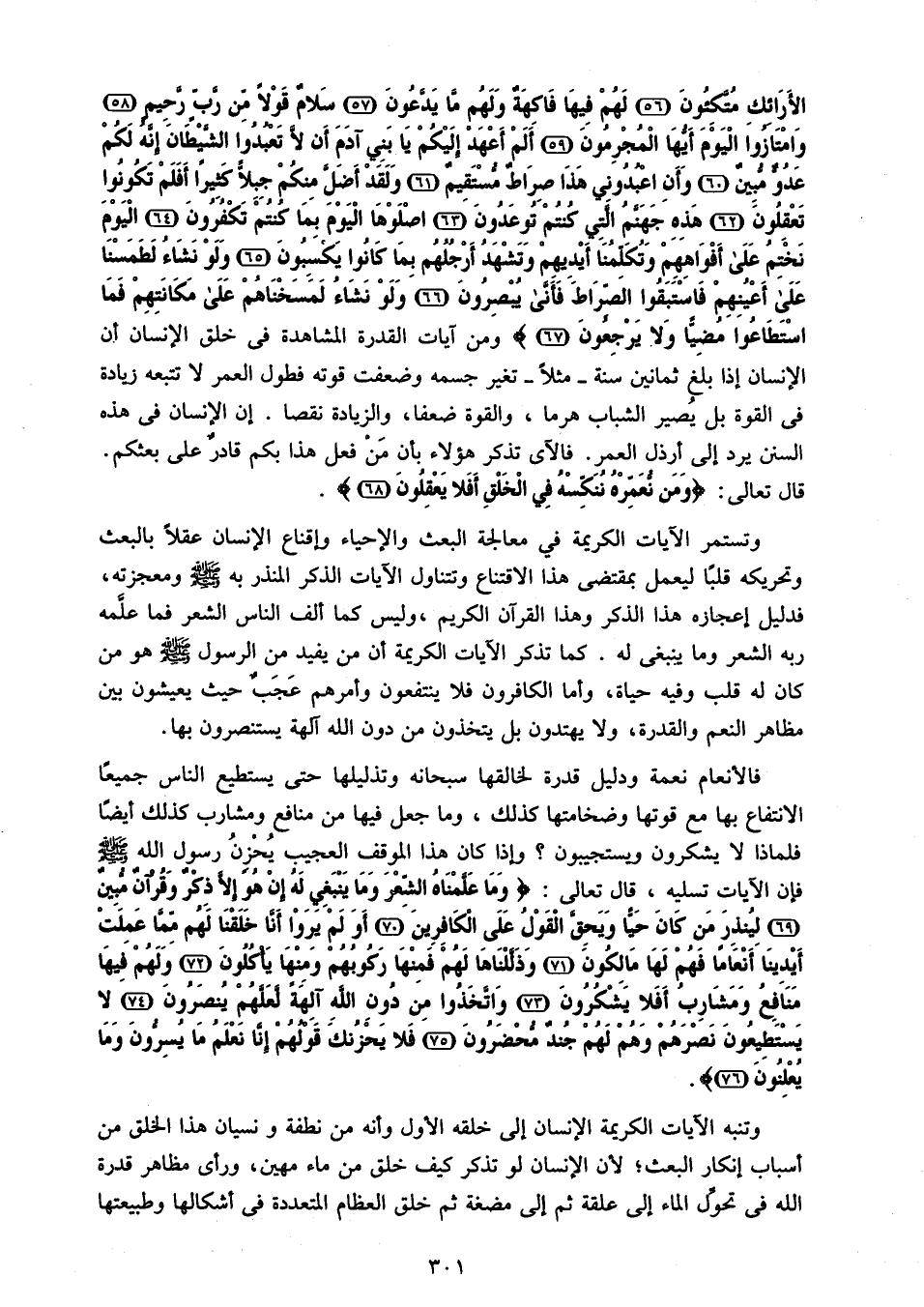 الْأَرائِكِ مُتَّكِؤُنَ (56) لَهُمْ فِيها فاكِهَةٌ وَلَهُمْ ما يَدَّعُونَ (57) سَلامٌ قَوْلًا مِنْ رَبٍّ رَحِيمٍ (58) وَامْتازُوا الْيَوْمَ أَيُّهَا الْمُجْرِمُونَ (59) أَلَمْ أَعْهَدْ إِلَيْكُمْ يا بَنِي آدَمَ أَنْ لا تَعْبُدُوا الشَّيْطانَ إِنَّهُ لَكُمْ عَدُوٌّ مُبِينٌ (60) وَأَنِ اعْبُدُونِي هذا صِراطٌ مُسْتَقِيمٌ (61) وَلَقَدْ أَضَلَّ مِنْكُمْ جِبِلًّا كَثِيراً أَفَلَمْ تَكُونُوا تَعْقِلُونَ (62) هذِهِ جَهَنَّمُ الَّتِي كُنْتُمْ تُوعَدُونَ (63) اصْلَوْهَا الْيَوْمَ بِما كُنْتُمْ تَكْفُرُونَ (64) الْيَوْمَ نَخْتِمُ عَلى أَفْواهِهِمْ وَتُكَلِّمُنا أَيْدِيهِمْ وَتَشْهَدُ أَرْجُلُهُمْ بِما كانُوا يَكْسِبُونَ (65) وَلَوْ نَشاءُ لَطَمَسْنا عَلى أَعْيُنِهِمْ فَاسْتَبَقُوا الصِّراطَ فَأَنَّى يُبْصِرُونَ (66) وَلَوْ نَشاءُ لَمَسَخْناهُمْ عَلى مَكانَتِهِمْ فَمَا اسْتَطاعُوا مُضِيًّا وَلا يَرْجِعُونَ (67) ومن آيات القدرة المشاهدة فى خلق الإنسان أن الإنسان إذا بلغ ثمانين سنة- مثلا- تغير جسمه وضعفت قوته فطول العمر لا تتبعه زيادة فى القوة بل يصير الشباب هرما، والقوة ضعفا، والزيادة نقصا. إن الإنسان فى هذه السنن يرد إلى أرذل العمر. فالآية تذكر هؤلاء بأن من فعل هذا بكم قادر على بعثكم.