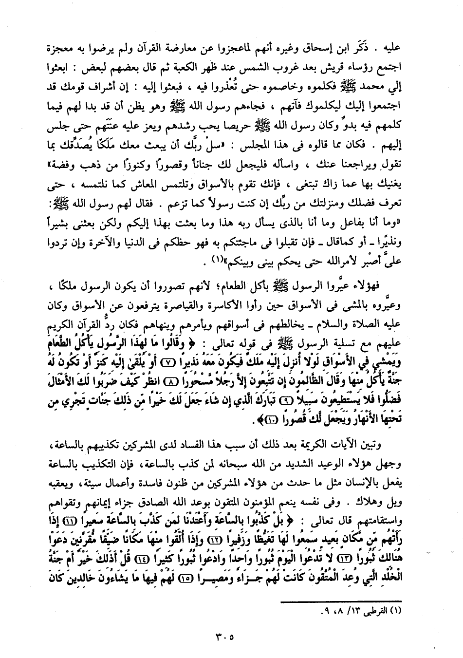 فهؤلاء عيّروا الرسول صلّى الله عليه وسلم بأكل الطعام؛ لأنهم تصوروا أن يكون الرسول ملكا، وعيّروه بالمشى فى الأسواق حين رأوا الأكاسرة والقياصرة يترفعون عن الأسواق وكان عليه الصلاة والسلام- يخالطهم فى أسواقهم ويأمرهم وينهاهم فكان ردّ القرآن الكريم عليهم مع تسلية الرسول صلّى الله عليه وسلم فى قوله تعالى: وَقالُوا مالِ هذَا الرَّسُولِ يَأْكُلُ الطَّعامَ وَيَمْشِي فِي الْأَسْواقِ لَوْلا أُنْزِلَ إِلَيْهِ مَلَكٌ فَيَكُونَ مَعَهُ نَذِيراً (7) أَوْ يُلْقى إِلَيْهِ كَنْزٌ أَوْ تَكُونُ لَهُ جَنَّةٌ يَأْكُلُ مِنْها وَقالَ الظَّالِمُونَ إِنْ تَتَّبِعُونَ إِلَّا رَجُلًا مَسْحُوراً (8) انْظُرْ كَيْفَ ضَرَبُوا لَكَ الْأَمْثالَ فَضَلُّوا فَلا يَسْتَطِيعُونَ سَبِيلًا (9) تَبارَكَ الَّذِي إِنْ شاءَ جَعَلَ لَكَ خَيْراً مِنْ ذلِكَ جَنَّاتٍ تَجْرِي مِنْ تَحْتِهَا الْأَنْهارُ وَيَجْعَلْ لَكَ قُصُوراً (10).