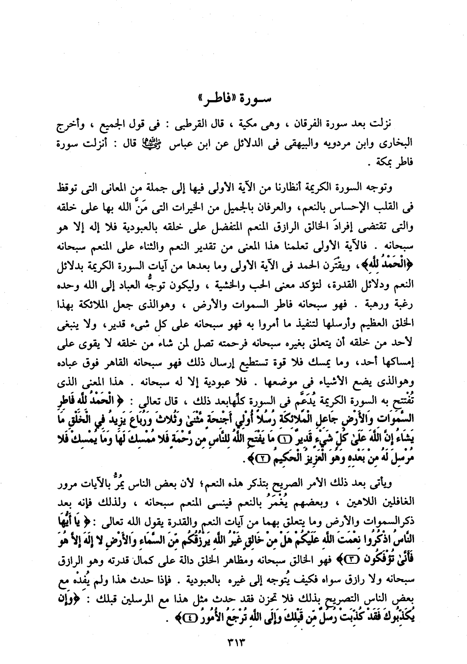 وتوجه السورة الكريمة أنظارنا من الآية الأولى فيها إلى جملة من المعانى التى توقظ فى القلب الإحساس بالنعم، والعرفان بالجميل من الخيرات التى منّ الله بها على خلقه والتى تقتضى إفراد الخالق الرازق المنعم المتفضل على خلقه بالعبودية فلا إله إلا هو سبحانه. فالآية الأولى تعلمنا هذا المعنى من تقدير النعم والثناء على المنعم سبحانه الْحَمْدُ لِلَّهِ، ويقترن الحمد فى الآية الأولى وما بعدها من آيات السورة الكريمة بدلائل النعم ودلائل القدرة، لتؤكد معنى الحب والخشية، وليكون توجّه العباد إلى الله وحده رغبة ورهبة. فهو سبحانه فاطر السموات والأرض، وهو الذى جعل الملائكة بهذا الخلق العظيم وأرسلها لتنفيذ ما أمروا به فهو سبحانه على كل شىء قدير، ولا ينبغى لأحد من خلقه أن يتعلق بغيره سبحانه فرحمته تصل لمن شاء من خلقه لا يقوى على إمساكها أحد، وما يمسك فلا قوة تستطيع إرسال ذلك فهو سبحانه القاهر فوق عباده وهو الذى يضع الأشياء فى موضعها. فلا عبودية إلا له سبحانه. هذا المعنى الذى تفتتح به السورة الكريمة يدعّم فى السورة كلّها بعد ذلك، قال تعالى: الْحَمْدُ لِلَّهِ فاطِرِ السَّماواتِ وَالْأَرْضِ جاعِلِ الْمَلائِكَةِ رُسُلًا أُولِي أَجْنِحَةٍ مَثْنى وَثُلاثَ وَرُباعَ يَزِيدُ فِي الْخَلْقِ ما يَشاءُ إِنَّ اللَّهَ عَلى كُلِّ شَيْءٍ قَدِيرٌ (1) ما يَفْتَحِ اللَّهُ لِلنَّاسِ مِنْ رَحْمَةٍ فَلا مُمْسِكَ لَها وَما يُمْسِكْ فَلا مُرْسِلَ لَهُ مِنْ بَعْدِهِ وَهُوَ الْعَزِيزُ الْحَكِيمُ (2).