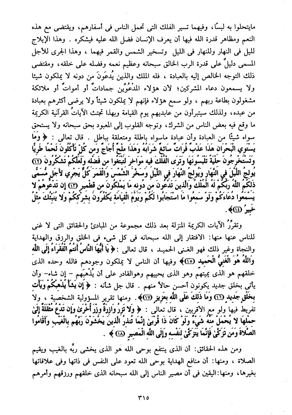 وتقرّر الآيات الكريمة المنزلة بعد ذلك مجموعة من المبادئ والحقائق التى لا غنى للناس عنها منها: الافتقار إلى الله سبحانه فى كل شىء فى الخلق والرزق والهداية والنجاة وغير ذلك فهو الغنى الحميد، قال تعالى: يا أَيُّهَا النَّاسُ أَنْتُمُ الْفُقَراءُ إِلَى اللَّهِ وَاللَّهُ هُوَ الْغَنِيُّ الْحَمِيدُ (15) وفيها أن الناس لا يملكون وجودهم فالله وحده الذى خلقهم هو الذى يميتهم وهو الذى يحييهم وهو القادر على أن يذهبهم- إن شاء- وأن يأتى بخلق جديد يكونون أحسن حالا منهم. قال جل شأنه: إِنْ يَشَأْ يُذْهِبْكُمْ وَيَأْتِ بِخَلْقٍ جَدِيدٍ (16) وَما ذلِكَ عَلَى اللَّهِ بِعَزِيزٍ (17). ومنها تقرير المسئولية الشخصية، ولا تفريط فيها ولو مع الأقربين، قال تعالى: وَلا تَزِرُ وازِرَةٌ وِزْرَ أُخْرى وَإِنْ تَدْعُ مُثْقَلَةٌ إِلى حِمْلِها لا يُحْمَلْ مِنْهُ شَيْءٌ وَلَوْ كانَ ذا قُرْبى إِنَّما تُنْذِرُ الَّذِينَ يَخْشَوْنَ رَبَّهُمْ بِالْغَيْبِ وَأَقامُوا الصَّلاةَ وَمَنْ تَزَكَّى فَإِنَّما يَتَزَكَّى لِنَفْسِهِ وَإِلَى اللَّهِ الْمَصِيرُ (18).
