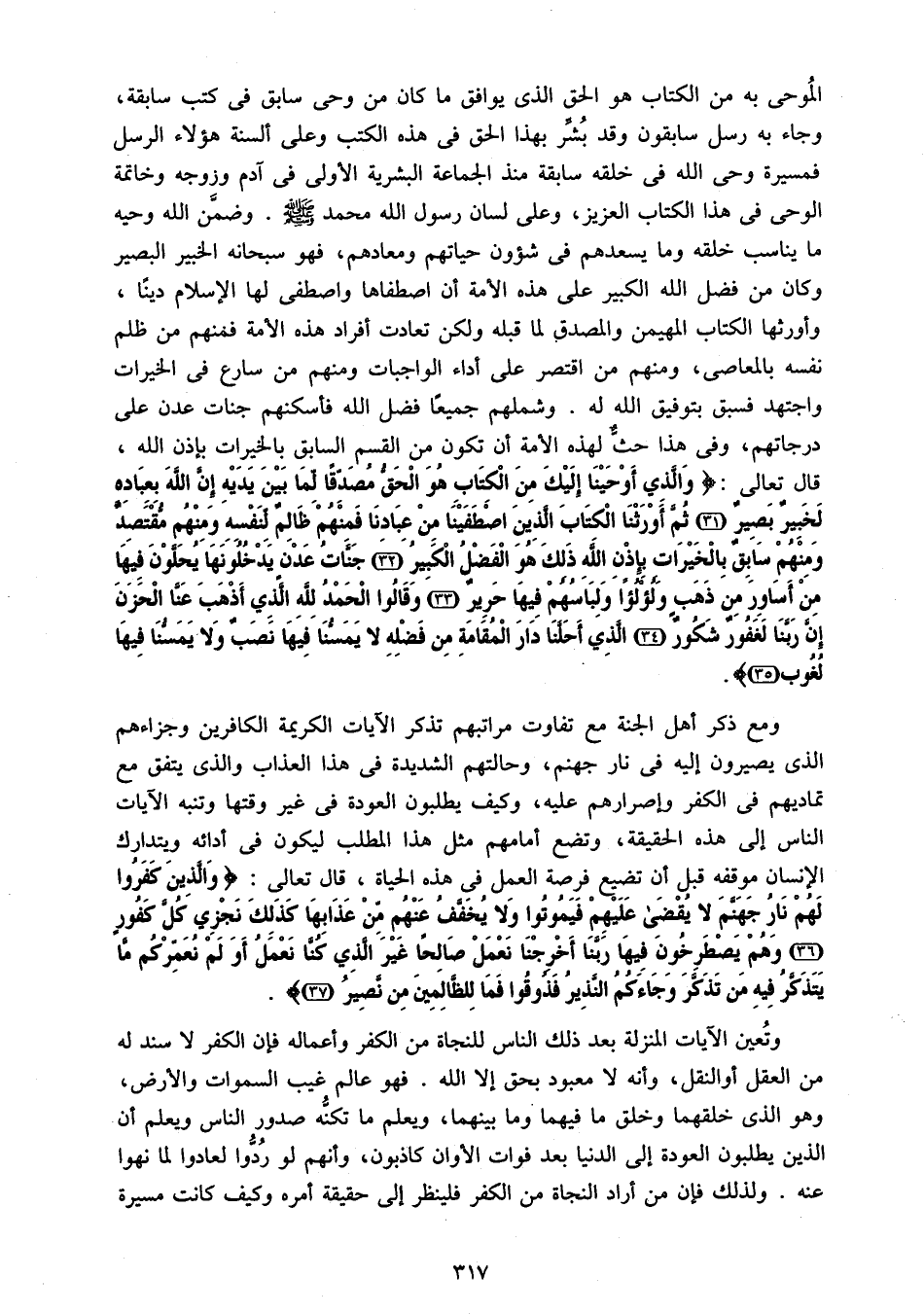 الموحى به من الكتاب هو الحق الذى يوافق ما كان من وحى سابق فى كتب سابقة، وجاء به رسل سابقون وقد بشّر بهذا الحق فى هذه الكتب وعلى ألسنة هؤلاء الرسل فمسيرة وحى الله فى خلقه سابقة منذ الجماعة البشرية الأولى فى آدم وزوجته وخاتمة الوحى فى هذا الكتاب العزيز، وعلى لسان رسول الله محمد صلّى الله عليه وسلم. وضمّن الله وحيه ما يناسب خلقه وما يسعدهم فى شئون حياتهم ومعادهم، فهو سبحانه الخبير البصير وكان من فضل الله الكبير على هذه الأمة أن اصطفاها واصطفى لها الإسلام دينا، وأورثها الكتاب المهيمن والمصدق لما قبله ولكن تعادت أفراد هذه الأمة فمنهم من ظلم نفسه بالمعاصى، ومنهم من اقتصر على أداء الواجبات ومنهم من سارع فى الخيرات واجتهد فسبق بتوفيق الله له. وشملهم جميعا فضل الله فأسكنهم جنات عدن على درجاتهم، وفى هذا حثّ لهذه الأمة أن تكون من القسم السابق بالخيرات بإذن الله، قال تعالى: وَالَّذِي أَوْحَيْنا إِلَيْكَ مِنَ الْكِتابِ هُوَ الْحَقُّ مُصَدِّقاً لِما بَيْنَ يَدَيْهِ إِنَّ اللَّهَ بِعِبادِهِ لَخَبِيرٌ بَصِيرٌ (31) ثُمَّ أَوْرَثْنَا الْكِتابَ الَّذِينَ اصْطَفَيْنا مِنْ عِبادِنا فَمِنْهُمْ ظالِمٌ لِنَفْسِهِ وَمِنْهُمْ مُقْتَصِدٌ وَمِنْهُمْ سابِقٌ بِالْخَيْراتِ بِإِذْنِ اللَّهِ ذلِكَ هُوَ الْفَضْلُ الْكَبِيرُ (32) جَنَّاتُ عَدْنٍ يَدْخُلُونَها يُحَلَّوْنَ فِيها مِنْ أَساوِرَ مِنْ ذَهَبٍ وَلُؤْلُؤاً وَلِباسُهُمْ فِيها حَرِيرٌ (33) وَقالُوا الْحَمْدُ لِلَّهِ الَّذِي أَذْهَبَ عَنَّا الْحَزَنَ إِنَّ رَبَّنا لَغَفُورٌ شَكُورٌ (34) الَّذِي أَحَلَّنا دارَ الْمُقامَةِ مِنْ فَضْلِهِ لا يَمَسُّنا فِيها نَصَبٌ وَلا يَمَسُّنا فِيها لُغُوبٌ (35).