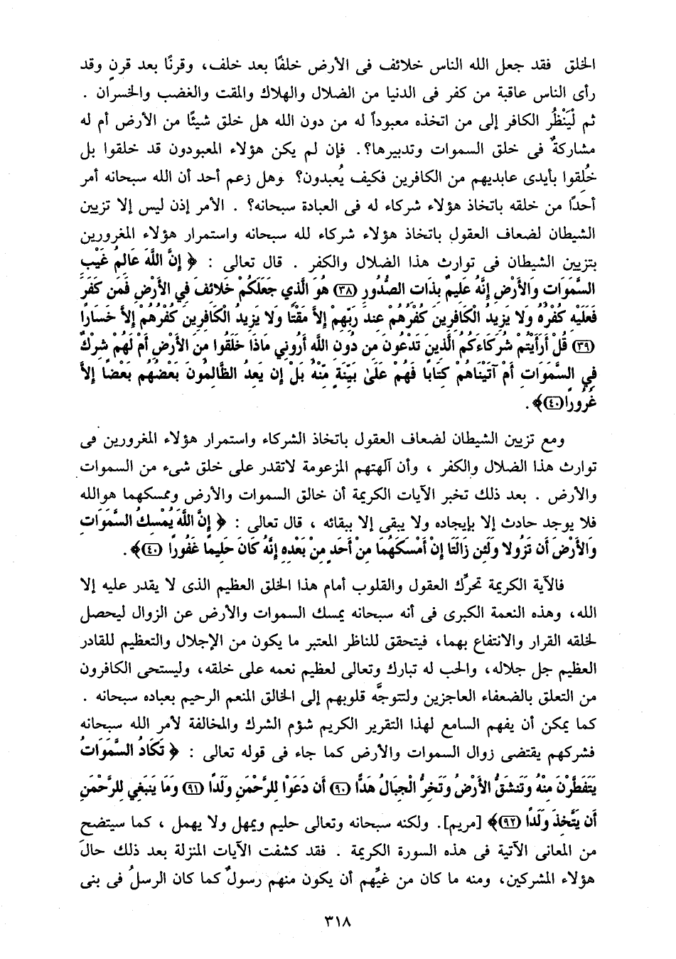 ومع تزيين الشيطان لضعاف العقول باتخاذ الشركاء واستمرار هؤلاء المغرورين فى توارث هذا الضلال والكفر، وأن آلهتهم المزعومة لا تقدر على خلق شىء من السموات والأرض. بعد ذلك تخبر الآيات الكريمة أن خالق السموات والأرض وممسكهما هو الله فلا يوجد حادث إلا بإيجاده ولا يبقى إلا ببقائه، قال تعالى: إِنَّ اللَّهَ يُمْسِكُ السَّماواتِ وَالْأَرْضَ أَنْ تَزُولا وَلَئِنْ زالَتا إِنْ أَمْسَكَهُما مِنْ أَحَدٍ مِنْ بَعْدِهِ إِنَّهُ كانَ حَلِيماً غَفُوراً (40).