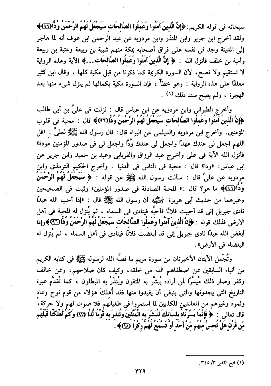 سبحانه فى قوله الكريم: إِنَّ الَّذِينَ آمَنُوا وَعَمِلُوا الصَّالِحاتِ سَيَجْعَلُ لَهُمُ الرَّحْمنُ وُدًّا (96) ولقد أخرج ابن جرير وابن المنذر وابن مردويه عن عبد الرحمن ابن عوف أنه لما هاجر إلى المدينة وجد فى نفسه على فراق أصحابه بمكة منهم شيبة بن ربيعة وعتبة بن ربيعة وأمية بن خلف فأنزل الله: إِنَّ الَّذِينَ آمَنُوا وَعَمِلُوا الصَّالِحاتِ ... الآية وهذه الرواية لا تستقيم ولا تصح، لأن السورة الكريمة كما ذكرنا من قبل مكية كلها، وقال ابن كثير معلقا على هذه الرواية: وهو خطأ، فإن السورة مكية بكمالها لم ينزل شىء منها بعد الهجرة، ولم يصح سند ذلك «1».