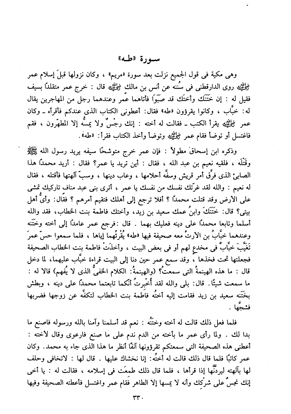 أعطنى هذه الصحيفة التى سمعتكم تقرءونها آنفا أنظر ما هذا الذى جاء به محمد. وكان عمر كاتبا فلما قال ذلك قالت له أخته: إنا نخشاك عليها. قال لها: لا تخافى وحلف لها بآلهته ليردّنّها إذا قرأها، فلما قال ذلك طمعت فى إسلامه، فقالت له: يا أخى إنك نجس على شركك وأنه لا يمسها إلا الطاهر فقام عمر واغتسل فأعطته الصحيفة وفيها