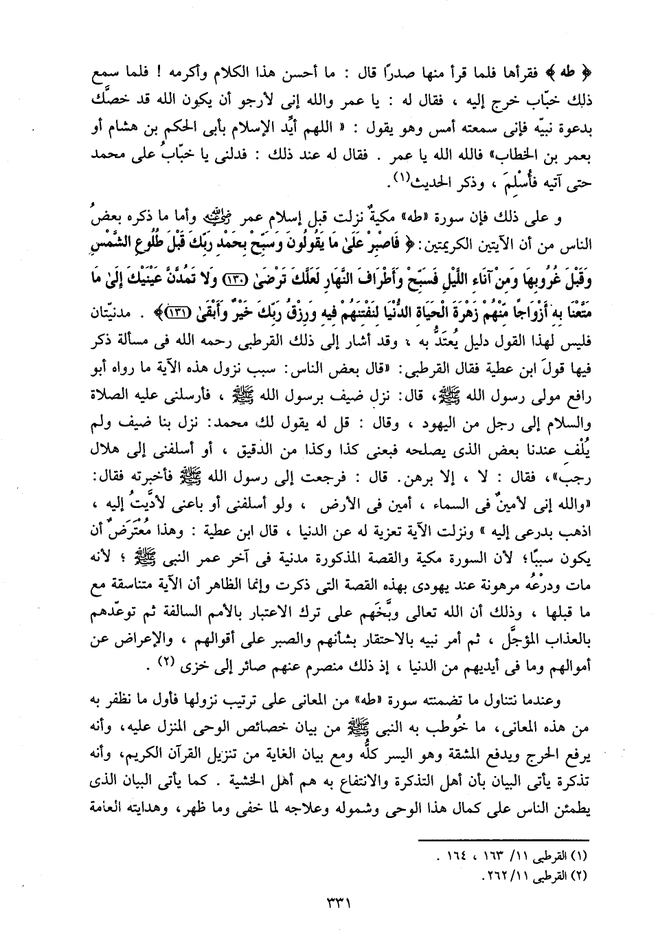 وعلى ذلك فإن سورة «طه» مكية نزلت قبل إسلام عمر رضي الله عنه وأما ما ذكره بعض الناس من أن الآيتين الكريمتين: فَاصْبِرْ عَلى ما يَقُولُونَ وَسَبِّحْ بِحَمْدِ رَبِّكَ قَبْلَ طُلُوعِ الشَّمْسِ وَقَبْلَ غُرُوبِها وَمِنْ آناءِ اللَّيْلِ فَسَبِّحْ وَأَطْرافَ النَّهارِ لَعَلَّكَ تَرْضى (130) وَلا تَمُدَّنَّ عَيْنَيْكَ إِلى ما مَتَّعْنا بِهِ أَزْواجاً مِنْهُمْ زَهْرَةَ الْحَياةِ الدُّنْيا لِنَفْتِنَهُمْ فِيهِ وَرِزْقُ رَبِّكَ خَيْرٌ وَأَبْقى (131). مدنيّتان فليس لهذا القول دليل يعتدّ به، وقد أشار إلى ذلك القرطبى رحمه الله فى مسألة ذكر فيها قول ابن عطية فقال القرطبى: «قال بعض الناس: سبب نزول هذه الآية ما رواه أبو رافع مولى رسول الله صلّى الله عليه وسلم، قال: نزل ضيف برسول الله صلّى الله عليه وسلم، فأرسلنى عليه الصلاة والسلام إلى رجل من اليهود، وقال: قل له يقول لك محمد: نزل بنا ضيف ولم يلف عندنا بعض الذى يصلحه فبعنى كذا وكذا من الدقيق، أو أسلفنى إلى هلال رجب»، فقال: لا، إلا برهن. قال: فرجعت إلى رسول الله صلّى الله عليه وسلم فأخبرته فقال: