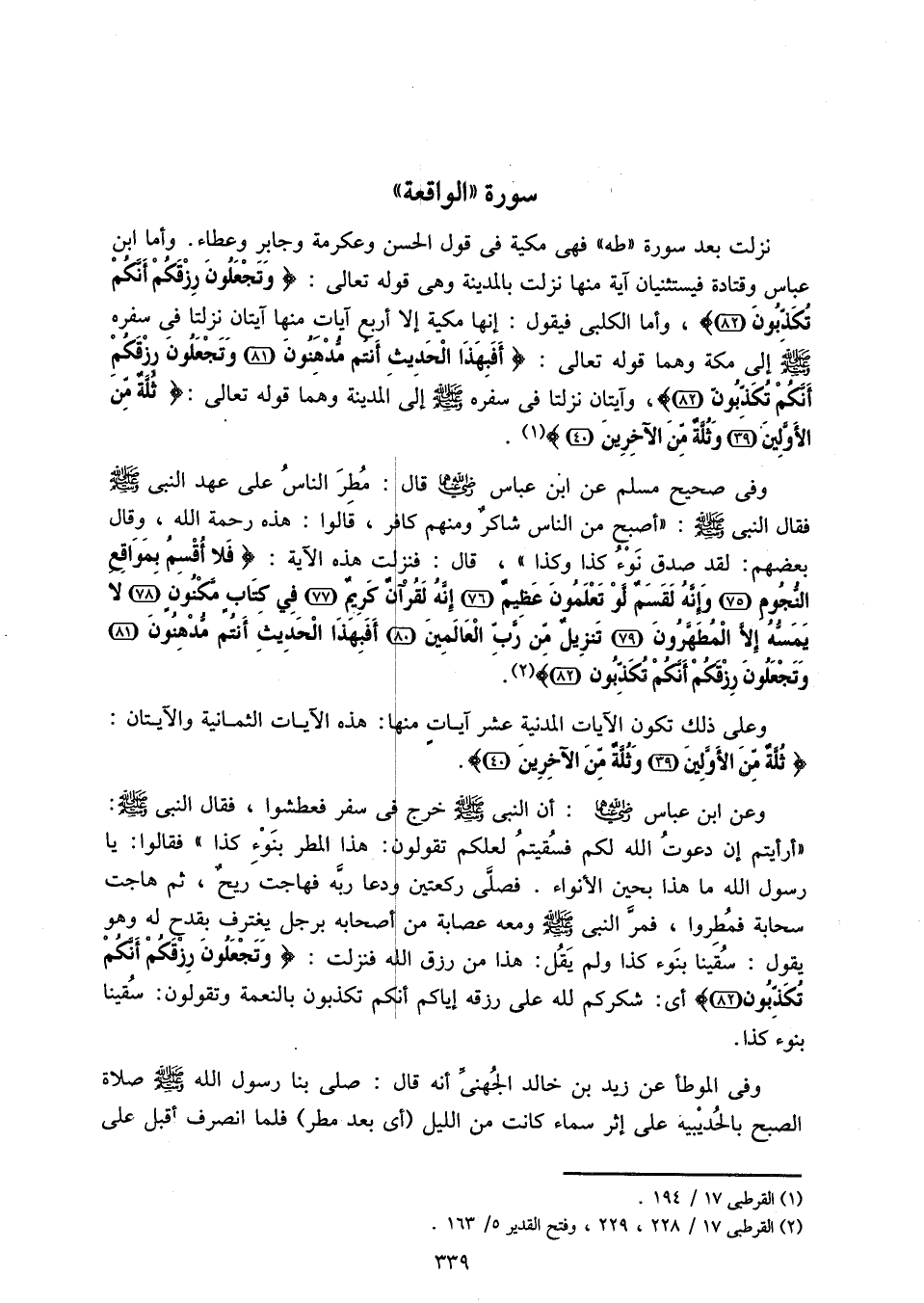 وفى صحيح مسلم عن ابن عباس رضي الله عنهما قال: مطر الناس على عهد النبى صلّى الله عليه وسلم فقال النبى صلّى الله عليه وسلم: «أصبح من الناس شاكر ومنهم كافر، قالوا: هذه رحمة الله، وقال بعضهم: لقد صدق نوء كذا وكذا»، قال: فنزلت هذه الآية: فَلا أُقْسِمُ بِمَواقِعِ النُّجُومِ (75) وَإِنَّهُ لَقَسَمٌ لَوْ تَعْلَمُونَ عَظِيمٌ (76) إِنَّهُ لَقُرْآنٌ كَرِيمٌ (77) فِي كِتابٍ مَكْنُونٍ (78) لا يَمَسُّهُ إِلَّا الْمُطَهَّرُونَ (79) تَنْزِيلٌ مِنْ رَبِّ الْعالَمِينَ (80) أَفَبِهذَا الْحَدِيثِ أَنْتُمْ مُدْهِنُونَ (81) وَتَجْعَلُونَ رِزْقَكُمْ أَنَّكُمْ تُكَذِّبُونَ (82) «2».