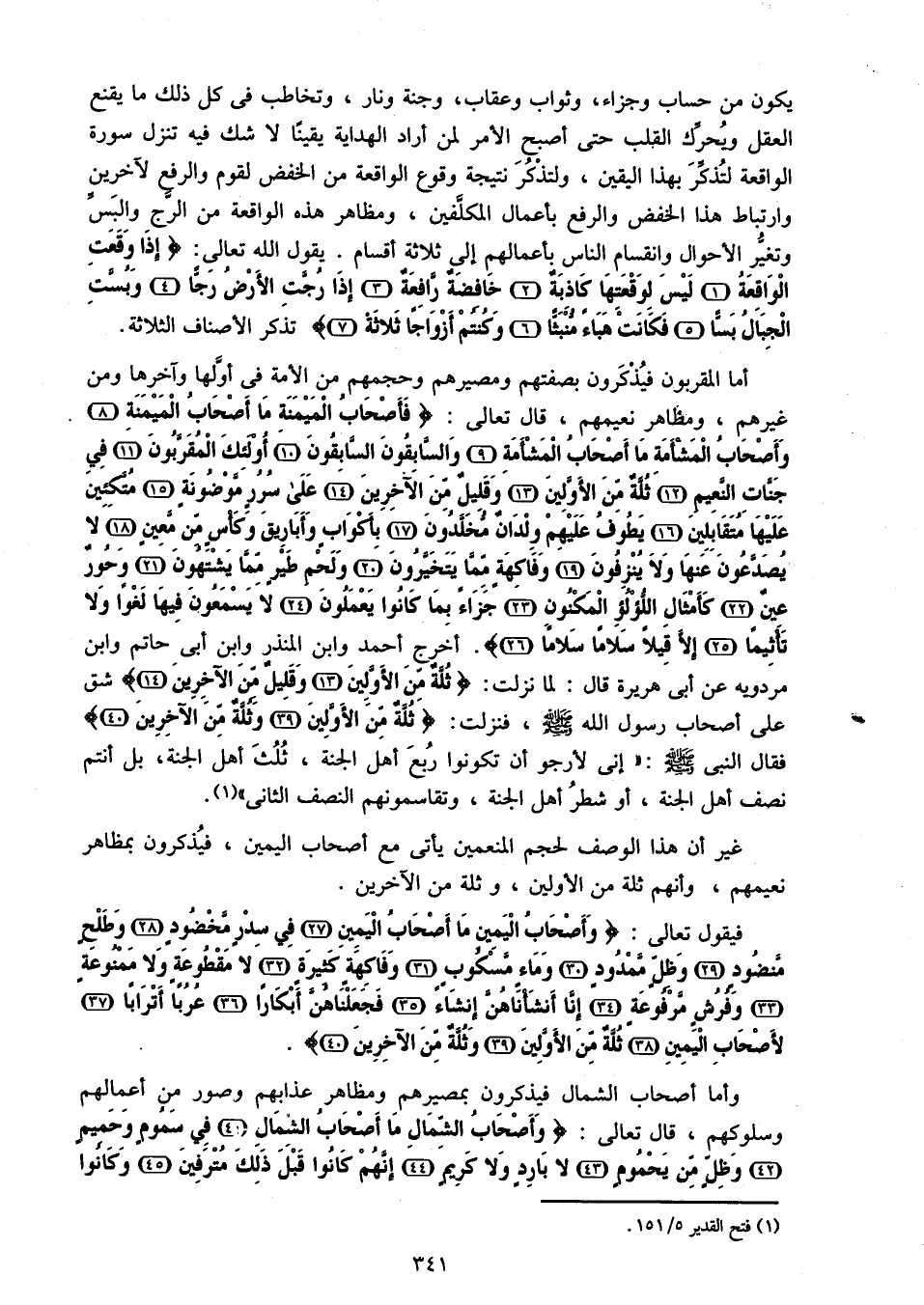 أما المقربون فيذكرون بصفتهم ومصيرهم وحجمهم من الأمة فى أوّلها وآخرها ومن غيرهم، ومظاهر نعيمهم، قال تعالى: فَأَصْحابُ الْمَيْمَنَةِ ما أَصْحابُ الْمَيْمَنَةِ (8) وَأَصْحابُ الْمَشْئَمَةِ ما أَصْحابُ الْمَشْئَمَةِ (9) وَالسَّابِقُونَ السَّابِقُونَ (10) أُولئِكَ الْمُقَرَّبُونَ (11) فِي جَنَّاتِ النَّعِيمِ (12) ثُلَّةٌ مِنَ الْأَوَّلِينَ (13) وَقَلِيلٌ مِنَ الْآخِرِينَ (14) عَلى سُرُرٍ مَوْضُونَةٍ (15) مُتَّكِئِينَ عَلَيْها مُتَقابِلِينَ (16) يَطُوفُ عَلَيْهِمْ وِلْدانٌ مُخَلَّدُونَ (17) بِأَكْوابٍ وَأَبارِيقَ وَكَأْسٍ مِنْ مَعِينٍ (18) لا يُصَدَّعُونَ عَنْها وَلا يُنْزِفُونَ (19) وَفاكِهَةٍ مِمَّا يَتَخَيَّرُونَ (20) وَلَحْمِ طَيْرٍ مِمَّا يَشْتَهُونَ (21) وَحُورٌ عِينٌ (22) كَأَمْثالِ اللُّؤْلُؤِ الْمَكْنُونِ (23) جَزاءً بِما كانُوا يَعْمَلُونَ (24) لا يَسْمَعُونَ فِيها لَغْواً وَلا تَأْثِيماً (25) إِلَّا قِيلًا سَلاماً سَلاماً (26). أخرج أحمد وابن المنذر وابن أبى حاتم وابن مردويه عن أبى هريرة قال: لما نزلت: ثُلَّةٌ مِنَ الْأَوَّلِينَ (13) وَقَلِيلٌ مِنَ الْآخِرِينَ (14) شق على أصحاب رسول الله صلّى الله عليه وسلم، فنزلت: ثُلَّةٌ مِنَ الْأَوَّلِينَ (39) وَثُلَّةٌ مِنَ الْآخِرِينَ (40) فقال النبى صلّى الله عليه وسلم: «إنى لأرجو أن تكونوا ربع أهل الجنة، ثلث أهل الجنة، بل أنتم نصف أهل الجنة، أو شطر أهل الجنة، وتقاسمونهم النصف الثانى» «1».