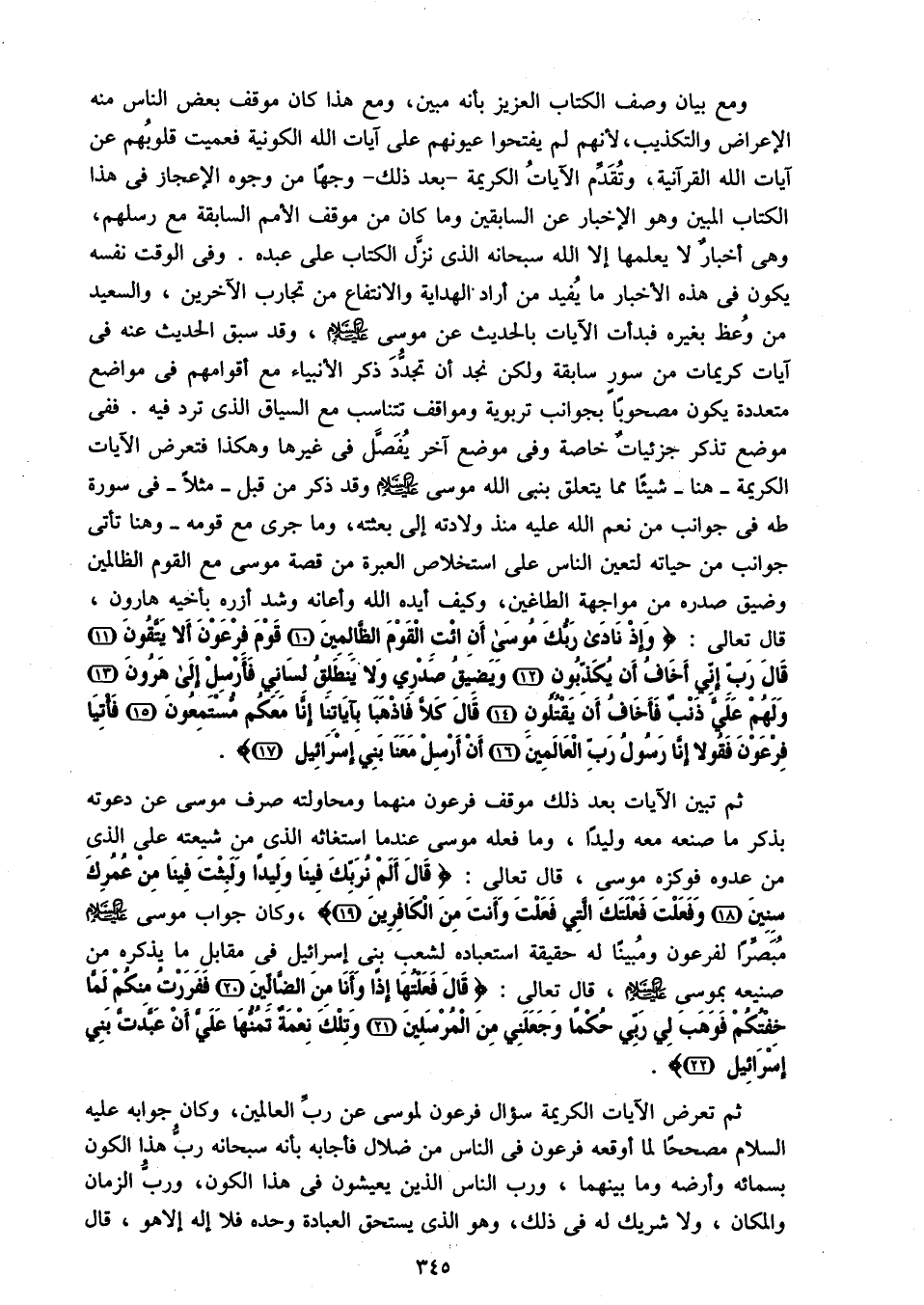 ومع بيان وصف الكتاب العزيز بأنه مبين، ومع هذا كان موقف بعض الناس منه الإعراض والتكذيب، لأنهم لم يفتحوا عيونهم على آيات الله الكونية فعميت قلوبهم عن آيات الله القرآنية، وتقدّم الآيات الكريمة- بعد ذلك- وجها من وجوه الإعجاز فى هذا الكتاب المبين وهو الإخبار عن السابقين وما كان من موقف الأمم السابقة مع رسلهم، وهى أخبار لا يعلمها إلا الله سبحانه الذى نزّل الكتاب على عبده. وفى الوقت نفسه يكون فى هذه الأخبار ما يفيد من أراد الهداية والانتفاع من تجارب الآخرين، والسعيد من وعظ بغيره فبدأت الآيات بالحديث عن موسى عليه السّلام، وقد سبق الحديث عنه فى آيات كريمات من سور سابقة ولكن نجد أن تجدّد ذكر الأنبياء مع أقوامهم فى مواضع متعددة يكون مصحوبا بجوانب تربوية ومواقف تتناسب مع السياق الذى ترد فيه. ففي موضع تذكر جزئيات خاصة وفى موضع آخر يفصّل فى غيرها وهكذا فتعرض الآيات الكريمة- هنا- شيئا مما يتعلق بنبى الله موسى عليه السّلام وقد ذكر من قبل- مثلا- فى سورة طه فى جوانب من نعم الله عليه منذ ولادته إلى بعثته، وما جرى مع قومه- وهنا تأتى جوانب من حياته لتعين الناس على استخلاص العبرة من قصة موسى مع القوم الظالمين وضيق صدره من مواجهة الطاغين، وكيف أيده الله وأعانه وشد أزره بأخيه هارون، قال تعالى: وَإِذْ نادى رَبُّكَ مُوسى أَنِ ائْتِ الْقَوْمَ الظَّالِمِينَ (10) قَوْمَ فِرْعَوْنَ أَلا يَتَّقُونَ (11) قالَ رَبِّ إِنِّي أَخافُ أَنْ يُكَذِّبُونِ (12) وَيَضِيقُ صَدْرِي وَلا يَنْطَلِقُ لِسانِي فَأَرْسِلْ إِلى هارُونَ (13) وَلَهُمْ عَلَيَّ ذَنْبٌ فَأَخافُ أَنْ يَقْتُلُونِ (14) قالَ كَلَّا فَاذْهَبا بِآياتِنا إِنَّا مَعَكُمْ مُسْتَمِعُونَ (15) فَأْتِيا فِرْعَوْنَ فَقُولا إِنَّا رَسُولُ رَبِّ الْعالَمِينَ (16) أَنْ أَرْسِلْ مَعَنا بَنِي إِسْرائِيلَ (17).