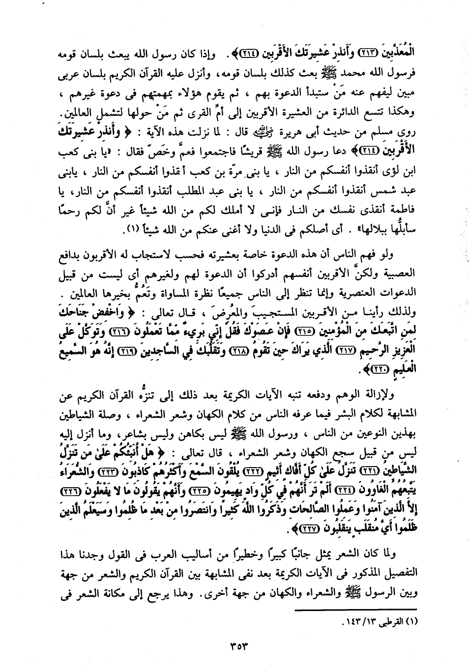 بهذين النوعين من الناس، ورسول الله صلّى الله عليه وسلم ليس بكاهن وليس بشاعر، وما أنزل إليه ليس من قبيل سجع الكهان وشعر الشعراء، قال تعالى: هَلْ أُنَبِّئُكُمْ عَلى مَنْ تَنَزَّلُ الشَّياطِينُ (221) تَنَزَّلُ عَلى كُلِّ أَفَّاكٍ أَثِيمٍ (222) يُلْقُونَ السَّمْعَ وَأَكْثَرُهُمْ كاذِبُونَ (223) وَالشُّعَراءُ يَتَّبِعُهُمُ الْغاوُونَ (224) أَلَمْ تَرَ أَنَّهُمْ فِي كُلِّ وادٍ يَهِيمُونَ (225) وَأَنَّهُمْ يَقُولُونَ ما لا يَفْعَلُونَ (226) إِلَّا الَّذِينَ آمَنُوا وَعَمِلُوا الصَّالِحاتِ وَذَكَرُوا اللَّهَ كَثِيراً وَانْتَصَرُوا مِنْ بَعْدِ ما ظُلِمُوا وَسَيَعْلَمُ الَّذِينَ ظَلَمُوا أَيَّ مُنْقَلَبٍ يَنْقَلِبُونَ (227).