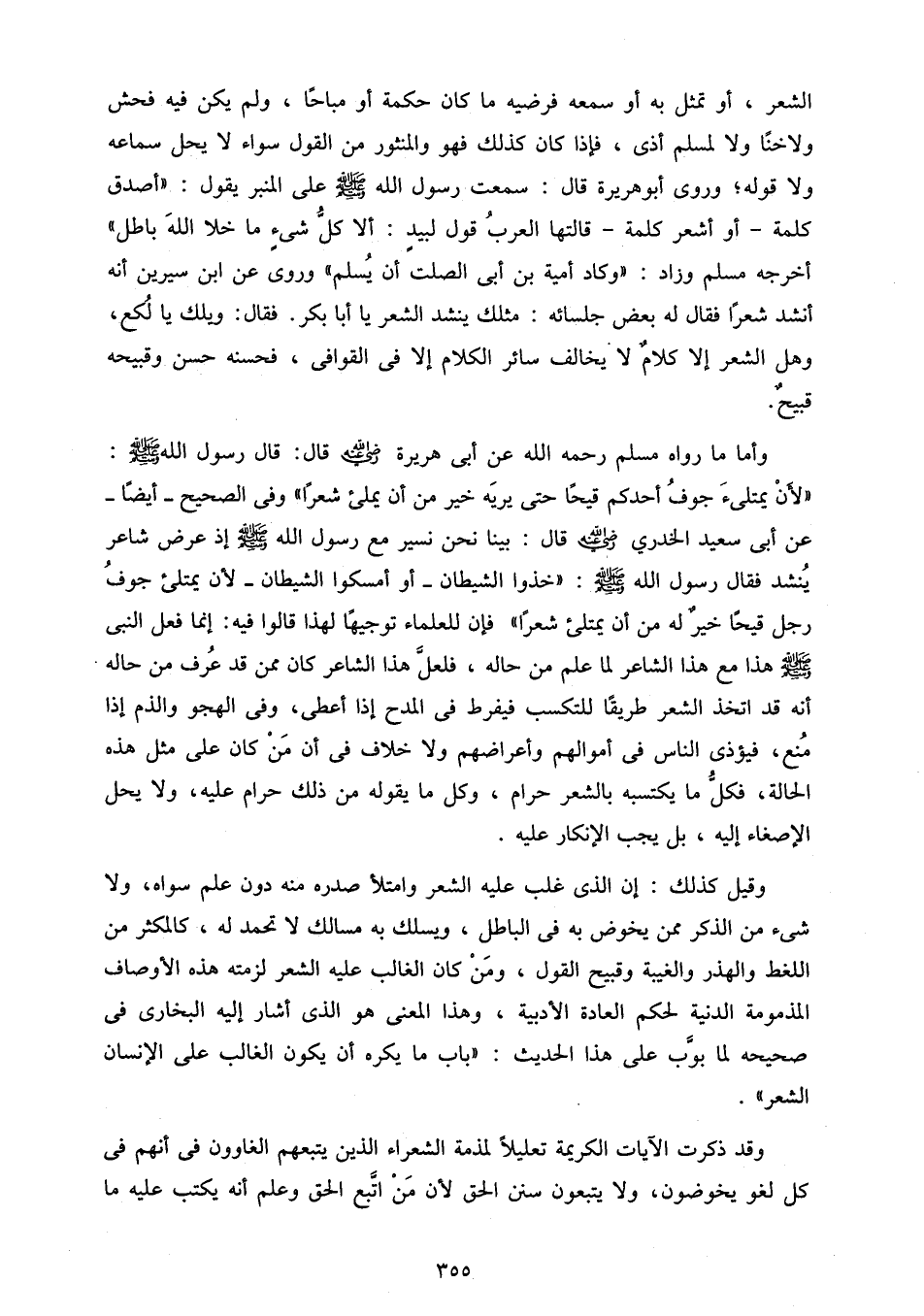 «لأن يمتلئ جوف أحدكم قيحا حتى يريه خير من أن يملئ شعرا» وفى الصحيح- أيضا- على أبى سعيد الخدري رضي الله عنه قال: «خذوا الشيطان- أو أمسكوا الشيطان- لأن يمتلئ جوف رجل قيحا خير له من أن يمتلئ شعرا» فإن للعلماء توجيها لهذا قالوا فيه: إنما فعل النبى صلّى الله عليه وسلم هذا مع هذا الشاعر لما علم من حاله، فلعلّ هذا الشاعر كان ممن قد عرف من حاله أنه قد اتخذ الشعر طريقا للتكسب فيفرط فى المدح إذا أعطى، وفى الهجو والذم إذا منع، فيؤذى الناس فى أموالهم وأعراضهم ولا خلاف فى أن من كان على مثل هذه الحالة، فكلّ ما يكتسبه بالشعر حرام، وكل ما يقوله من ذلك حرام عليه، ولا يحل الإصغاء إليه، بل يجب الإنكار عليه.