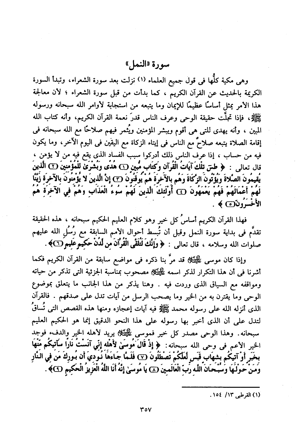 وهى مكية كلّها فى قول جميع العلماء «1» نزلت بعد سورة الشعراء، وتبدأ السورة الكريمة بالحديث عن القرآن الكريم، كما بدأت من قبل سورة الشعراء؛ لأن معالجة هذا الأمر يمثل أساسا عظيما للإيمان وما يتبعه من استجابة لأوامر الله سبحانه ورسوله صلّى الله عليه وسلم، فإذا تجلّت حقيقة الوحى وعرف الناس قدر نعمة القرآن الكريم، وأنه كتاب الله المبين، وأنه يهدى للتى هى أقوم ويبشر المؤمنين ويثمر فيهم صلاحا مع الله سبحانه فى إقامة الصلاة يتبعه صلاح مع الناس فى إيتاء الزكاة مع اليقين فى اليوم الآخر، وما يكون فيه من حساب، إذا عرف الناس ذلك أدركوا سبب الفساد الذى يقع فيه من لا يؤمن، قال تعالى: طس تِلْكَ آياتُ الْقُرْآنِ وَكِتابٍ مُبِينٍ (1) هُدىً وَبُشْرى لِلْمُؤْمِنِينَ (2) الَّذِينَ يُقِيمُونَ الصَّلاةَ وَيُؤْتُونَ الزَّكاةَ وَهُمْ بِالْآخِرَةِ هُمْ يُوقِنُونَ (3) إِنَّ الَّذِينَ لا يُؤْمِنُونَ بِالْآخِرَةِ زَيَّنَّا لَهُمْ أَعْمالَهُمْ فَهُمْ يَعْمَهُونَ (4) أُوْلئِكَ الَّذِينَ لَهُمْ سُوءُ الْعَذابِ وَهُمْ فِي الْآخِرَةِ هُمُ الْأَخْسَرُونَ (5).