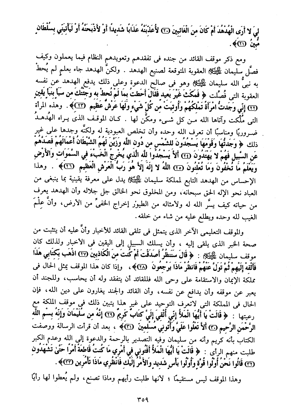والموقف التعليمى الآخر الذى يتمثل فى تلقى القائد للأخبار وأنّ عليه أن يتثبت من صحة الخبر الذى يلقى إليه، وأن يسلك السبيل إلى اليقين فى الأخبار ولذلك كان موقف سليمان عليه السّلام: قالَ سَنَنْظُرُ أَصَدَقْتَ أَمْ كُنْتَ مِنَ الْكاذِبِينَ (27) اذْهَبْ بِكِتابِي هذا فَأَلْقِهْ إِلَيْهِمْ ثُمَّ تَوَلَّ عَنْهُمْ فَانْظُرْ ماذا يَرْجِعُونَ (28)، وإذا كان هذا الموقف يمثل الحال فى مملكة الإيمان والاستقامة على وحى الله فللقائد أن يتفقد وله أن يحاسب، وللجند أن يعبر عن موقفه وأن يدافع عن نفسه، وأن القائد والجند يغارون على دين الله، فإن الحال فى المملكة التى لا تعرف التوحيد على غير هذا يتبين ذلك فى موقف الملكة مع رعيتها: قالَتْ يا أَيُّهَا الْمَلَأُ إِنِّي أُلْقِيَ إِلَيَّ كِتابٌ كَرِيمٌ (29) إِنَّهُ مِنْ سُلَيْمانَ وَإِنَّهُ بِسْمِ اللَّهِ الرَّحْمنِ الرَّحِيمِ (30) أَلَّا تَعْلُوا عَلَيَّ وَأْتُونِي مُسْلِمِينَ (31)، بعد أن قرأت الرسالة ووصفت الكتاب بأنه كريم وأنه من سليمان وفيه التصدير بالرحمة والدعوة إلى الله وعدم الكبر طلبت منهم الرأى: قالَتْ يا أَيُّهَا الْمَلَأُ أَفْتُونِي فِي أَمْرِي ما كُنْتُ قاطِعَةً أَمْراً حَتَّى تَشْهَدُونِ (32) قالُوا نَحْنُ أُولُوا قُوَّةٍ وَأُولُوا بَأْسٍ شَدِيدٍ وَالْأَمْرُ إِلَيْكِ فَانْظُرِي ماذا تَأْمُرِينَ (33).