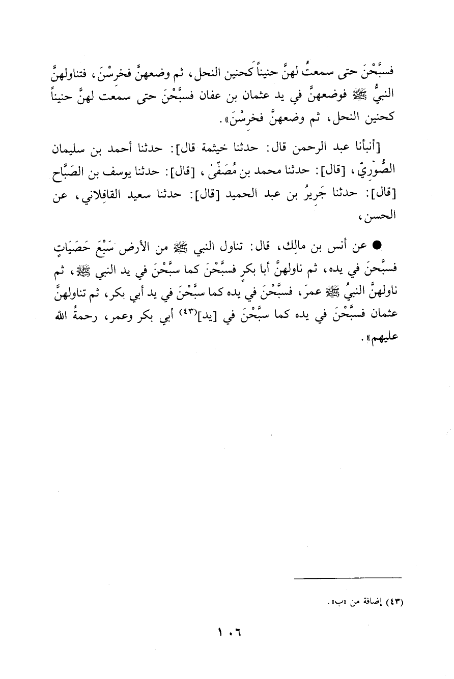 أَنْبَأَنَا عَبْدُ الرَّحْمَنِ قَالَ: حَدَّثَنَا خَيْثَمَةُ , قَالَ: حَدَّثَنَا أَحْمَدُ بْنُ سُلَيْمَانَ الصُّورِيُّ , قَالَ: حَدَّثَنَا مُحَمَّدُ بْنُ مُصَفَّى , قَالَ: حَدَّثَنَا يُوسُفُ بْنُ الصَّبَّاحِ , قَالَ: حَدَّثَنَا جَرِيرُ بْنُ عَبْدِ الْحَمِيدِ , قَالَ: حَدَّثَنَا سَعِيدٌ الْقَافْلَانِيُّ , عَنِ الْحَسَنِ , عَنْ أَنَسِ بْنِ مَالِكٍ , قَالَ: §تَنَاوَلَ النَّبِيُّ صَلَّى اللهُ عَلَيْهِ وَسَلَّمَ مِنَ الْأَرْضِ سَبْعَ حَصَيَاتٍ , فَسَبَّحْنَ فِي يَدِهِ , ثُمَّ نَاوَلَهُنَّ أَبَا بَكْرٍ , فَسَبَّحْنَ كَمَا سَبَّحْنَ فِي يَدِ النَّبِيِّ صَلَّى اللهُ عَلَيْهِ وَسَلَّمَ , ثُمَّ نَاوَلَهُنَّ النَّبِيُّ صَلَّى اللهُ عَلَيْهِ وَسَلَّمَ عُمَرَ , فَسَبَّحْنَ فِي يَدِهِ كَمَا سَبَّحْنَ فِي يَدِ أَبِي بَكْرٍ , ثُمَّ تَنَاوَلَهُنَّ عُثْمَانُ فَسَبَّحْنَ فِي يَدِهِ كَمَا سَبَّحْنَ فِي يَدِ أَبِي بَكْرٍ وَعُمَرَ رَحْمَةُ اللَّهِ عَلَيْهِمْ