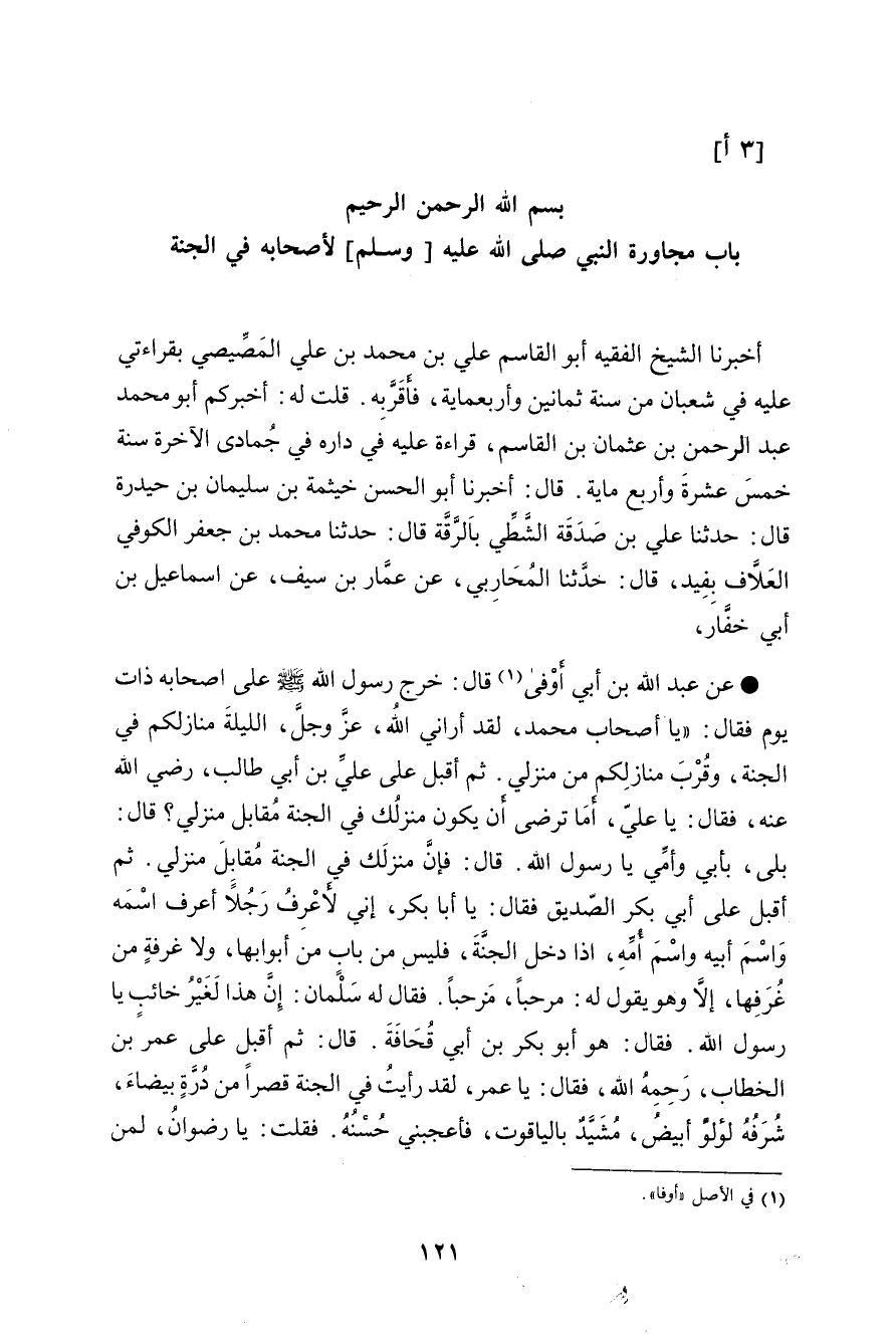 رِوَايَةُ أَبِي الْحَسَنِ خَيْثَمَةَ بْنِ سُلَيْمَانَ بْنِ حَيْدَرَةَ الْأَطْرَابُلْسِيِّ، عَنْ شُيُوخِهِ، رِوَايَةَ أَبِي مُحَمَّدٍ عَبْدِ الرَّحْمَنِ بِنِ عُثْمَانَ بْنِ الْقَاسِمِ بْنِ مَعْرُوفِ بْنِ أَبِي نَصْرٍ عَنْهُ، رِوَايَةَ الشَّيْخِ الْفَقِيهِ الْإِمَامِ أَبِي الْقَاسِمِ عَلِيِّ بْنِ مُحُمَّدِ بْنِ عَلِيِّ بْنِ أَحْمَدَ الْمِصِّيصِيِّ السُّلَمِيِّ عَنْهُ. سَمَاعًا لِهِبَةِ الدِّينِ أَحْمَدَ بْنِ عَبْدِ اللَّهِ بْنِ عَلِيِّ بْنِ طَاوُسٍ الْبَغْدَادِيِّ الْمُقْرِئِ نَفَعَهُ اللَّهُ بِهِ، آمِينَ، حَدَّثَنَا عَلِيُّ بْنُ صَدَقَةَ الشَّطِّيُّ بِالرَّقَّةِ قَالَ: حَدَّثَنَا مُحَمَّدُ بْنُ جَعْفَرٍ الْكُوفِيُّ الْعَلَّافُ بِفِيدَ قَالَ: حَدَّثَنَا الْمُحَارِبِيُّ , عَنْ عَمَّارِ بْنِ سَيْفٍ , عَنْ إِسْمَاعِيلَ بْنِ أَبِي خَفَّارٍ , عَنْ عَبْدِ اللَّهِ بْنِ أَبِي أَوْفَى قَالَ: خَرَجَ رَسُولُ اللَّهِ صَلَّى اللهُ عَلَيْهِ وَسَلَّمَ عَلَى أَصْحَابِهِ ذَاتَ يَوْمٍ فَقَالَ: «يَا أَصْحَابَ مُحَمَّدٍ , لَقَدْ أَرَانِي اللَّهُ عَزَّ وَجَلَّ اللَّيْلَةَ مَنَازِلَكُمْ فِي الْجَنَّةِ , وَقُرْبَ مَنَازِلِكُمْ مِنْ مَنْزِلِي» ثُمَّ أَقْبَلَ عَلَى عَلِيِّ بْنِ أَبِي طَالِبٍ رَضِيَ اللَّهُ عَنْهُ فَقَالَ: " يَا عَلِيُّ , §أَمَا تَرْضَى أَنْ يَكُونَ مَنْزِلُكَ فِي الْجَنَّةِ مُقَابِلَ مَنْزِلِي؟ قَالَ: بَلَى بِأَبِي وَأُمِّي يَا رَسُولَ اللَّهِ , قَالَ: «فَإِنَّ مَنْزِلَكَ فِي الْجَنَّةِ مُقَابِلُ مَنْزِلِي» ثُمَّ أَقْبَلَ عَلَى أَبِي بَكْرٍ الصِّدِّيقِ فَقَالَ: " يَا أَبَا بَكْرٍ , إِنِّي لَأَعْرِفُ رَجُلًا أَعْرِفُ اسْمَهُ وَاسْمَ أَبِيهِ وَاسْمَ أُمِّهِ إِذَا دَخَلَ الْجَنَّةَ فَلَيْسَ مِنْ بَابٍ مِنْ أَبْوَابِهَا , وَلَا غُرْفَةٍ مِنْ غُرَفِهَا , إِلَّا وَهُوَ يَقُولُ لَهُ: مَرْحَبًا مَرْحَبًا , فَقَالَ لَهُ سَلْمَانُ: إِنَّ هَذَا لَغَيْرُ خَائِبٍ يَا رَسُولَ اللَّهِ , فَقَالَ: «هُوَ أَبُو بَكْرِ بْنُ أَبِي قُحَافَةَ» قَالَ: ثُمَّ أَقْبَلَ عَلَى عُمَرَ بْنِ الْخَطَّابِ رَحِمَهُ اللَّهُ فَقَالَ: " يَا عُمَرُ , لَقَدْ رَأَيْتُ فِيَ الْجَنَّةِ قَصْرًا مِنْ دُرَّةٍ بَيْضَاءَ , شُرَفُهُ لُؤْلُؤٌ أَبْيَضُ مَشِيدٌ بِالْيَاقُوتِ , فَأَعْجَبَنِي حُسْنُهُ فَقُلْتُ: يَا رَضْوَانُ , لِمَنْ -[122]- هَذَا؟ فَقَالَ: هَذَا لِفَتًى مِنْ قُرَيْشٍ , فَظَنَنْتُ أَنَّهُ لِي , فَذَهَبْتُ لِأَدْخُلَهُ , فَقَالَ لِي: يَا مُحَمَّدُ , هَذَا لِعُمَرَ بْنِ الْخَطَّابِ " , قَالَ: «فَمَا مَنَعَنِي مِنْ دُخُولِهِ إِلَّا غَيْرَتُكَ يَا أَبَا حَفْصٍ» قَالَ: فَبَكَى عُمَرُ ثُمَّ قَالَ: بِأَبِي وَأُمِّي , أَعَلَيْكَ أَغَارُ يَا رَسُولَ اللَّهِ؟ قَالَ: ثُمَّ أَقْبَلَ عَلَى عُثْمَانَ بْنِ عَفَّانَ وَقَالَ: «يَا عُثْمَانُ , إِنَّ لِكُلِّ نَبِيٍّ رَفِيقًا فِي الْجَنَّةِ , وَأَنْتَ رَفِيقِي فِي الْجَنَّةِ» قَالَ: ثُمَّ أَقْبَلَ عَلَى طَلْحَةَ بْنِ عُبَيْدِ اللَّهِ وَالزُّبَيْرِ بْنِ الْعَوَّامِ فَقَالَ: " يَا طَلْحَةُ , وَيَا زُبَيْرُ إِنَّ لِكُلِّ نَبِيٍّ حَوَارِيَّ , وَأَنْتُمَا حَوَارِيَّ قَالَ: ثُمَّ أَقْبَلَ عَلَى عَبْدِ الرَّحْمَنِ بْنِ عَوْفٍ فَقَالَ: " يَا عَبْدَ الرَّحْمَنِ بْنَ عَوْفٍ , لَقَدْ بُطِّيءَ بِكَ عَنِّي مِنْ بَيْنِ أَصْحَابِي حَتَّى خَشِيتُ أَنْ تَكُونَ قَدْ هَلَكْتَ , ثُمَّ جِئْتَ وَقَدْ عَرِقْتَ عَرَقًا شَدِيدًا , فَقُلْتُ لَكَ: مَا شَأْنُكَ؟ فَقُلْتَ: يَا رَسُولَ اللَّهِ , مِنْ كَثْرَةِ مَالِي , مَا زِلْتُ مَوْقُوفًا مُحْتَبِيًا أُسْأَلُ عَنْ مَالِي مِنْ أَيْنَ اكْتَسَبْتُهُ؟ وَفِيمَا أَنْفَقْتُهُ؟ " قَالَ: فَبَكَى عَبْدُ الرَّحْمَنِ بْنُ عَوْفٍ فَقَالَ: بِأَبِي وَأُمِّي يَا رَسُولَ اللَّهِ , هَذِهِ مِائَةُ رَاحِلَةٍ ج