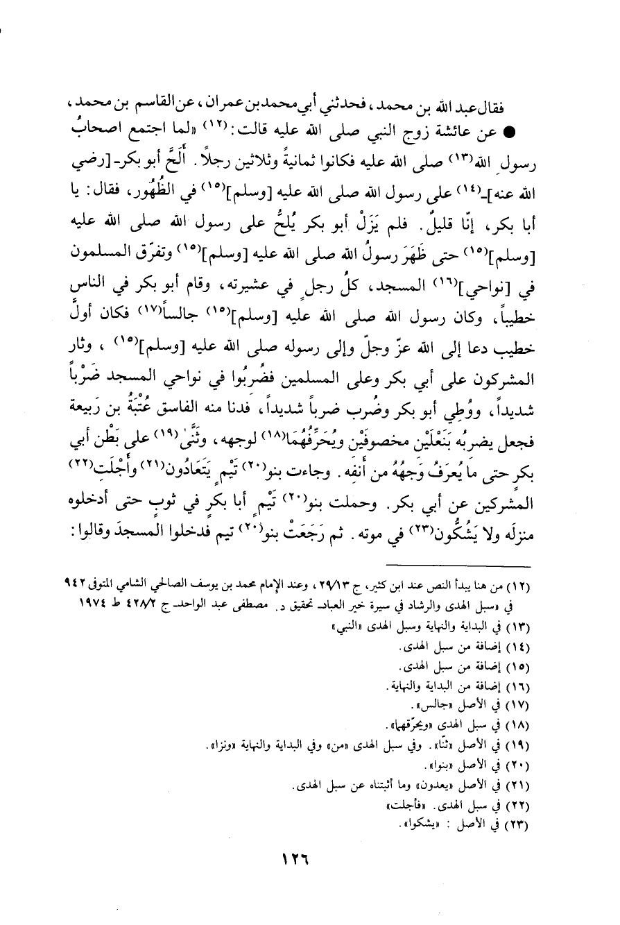 فَقَالَ عَبْدُ اللَّهِ بْنُ مُحَمَّدٍ فَحَدَّثَنِي أَبِي مُحَمَّدُ بْنُ عِمْرَانَ , عَنِ الْقَاسِمِ بْنِ مُحَمَّدٍ , عَنْ عَائِشَةَ زَوْجِ النَّبِيِّ صَلَّى اللهُ عَلَيْهِ وَسَلَّمَ قَالَتْ: §لَمَّا اجْتَمَعَ أَصْحَابُ رَسُولِ اللَّهِ صَلَّى اللهُ عَلَيْهِ وَسَلَّمَ فَكَانُوا ثَمَانِيَةً وَثَلَاثِينَ رَجُلًا , أَلَحَّ أَبُو بَكْرٍ رَضِيَ اللَّهُ عَنْهُ عَلَى رَسُولِ اللَّهِ صَلَّى اللهُ عَلَيْهِ وَسَلَّمَ فِي الظُّهُورِ , فَقَالَ: «يَا أَبَا بَكْرٍ , إِنَّا قَلِيلٌ» , فَلَمْ يَزَلْ أَبُو بَكْرٍ يُلِحُّ عَلَى رَسُولِ اللَّهِ صَلَّى اللهُ عَلَيْهِ وَسَلَّمَ حَتَّى ظَهَرَ رَسُولُ اللَّهِ صَلَّى اللهُ عَلَيْهِ وَسَلَّمَ وَتَفَرَّقَ الْمُسْلِمُونَ فِي نَوَاحِي الْمَسْجِدِ , كُلُّ رَجُلٍ فِي عَشِيرَتِهِ , وَقَامَ أَبُو بَكْرٍ فِي النَّاسِ خَطِيبًا , وَكَانَ رَسُولُ اللَّهِ صَلَّى اللهُ عَلَيْهِ وَسَلَّمَ جَالِسًا , فَكَانَ أَوَّلَ خَطِيبٍ دَعَا إِلَى اللَّهِ عَزَّ وَجَلَّ وَإِلَى رَسُولِهِ صَلَّى اللهُ عَلَيْهِ وَسَلَّمَ , وَثَارَ الْمُشْرِكُونَ عَلَى أَبِي بَكْرٍ وَعَلَى الْمُسْلِمِينَ فَضُرِبُوا فِي نَوَاحِي الْمَسْجِدِ ضَرْبًا شَدِيدًا , وَوُطِيَ أَبُو بَكْرٍ وَضُرِبَ ضَرْبًا شَدِيدًا , فَدَنَا مِنْهُ الْفَاسِقُ عُتْبَةُ بْنُ رَبِيعَةَ فَجَعَلَ يَضْرِبُهُ بِنَعْلَيْنِ مَخْصُوفَيْنِ وَيُحَرِّفُهُمَا لِوَجْهِهِ وَثَنَى عَلَى بَطْنِ أَبِي بَكْرٍ حَتَّى مَا يُعْرَفُ وَجْهُهُ مِنْ أَنْفِهِ , وَجَاءَتْ بَنُو تَيْمٍ يَتَعَادَوْنَ وَأَجْلَتِ الْمُشْرِكِينَ عَنْ أَبِي بَكْرٍ , وَحَمَلَتْ بَنُو تَيْمٍ أَبَا بَكْرٍ فِي ثَوْبٍ حَتَّى أَدْخَلُوهُ مَنْزِلَهُ , وَلَا يَشُكُّونَ فِي مَوْتِهِ , ثُمَّ رَجَعَتْ بَنُو تَيْمٍ فَدَخَلُوا الْمَسْجِدَ وَقَالُوا -[127]-: وَاللَّهِ لَئِنْ مَاتَ أَبُو بَكْرٍ لَنَقْتُلَنَّ عُتْبَةَ بْنَ رَبِيعَةَ , فَرَجَعُوا إِلَى أَبِي بَكْرٍ فَجَعَلَ أَبُو قُحَافَةَ وَبَنُو تَيْمٍ يُكَلِّمُونَ أَبَا بَكْرٍ حَتَّى أَجَابَ , فَتَكَلَّمَ آخِرَ النَّهَارِ فَقَالَ: مَا فَعَلَ رَسُولُ اللَّهِ صَلَّى اللهُ عَلَيْهِ وَسَلَّمَ؟ فَمَسُّوا مِنْهُ بِأَلْسِنَتِهِمْ وَعَذَلُوهُ , ثُمَّ قَامُوا وَقَالُوا لَأُمِّهِ أُمِّ الْخَيْرِ بِنْتِ صَخْرٍ: انْظُرِي أَنْ تُطْعِمِيهِ شَيْئًا , أَوْ تَسْقِيهِ إِيَّاهُ , فَلَمَّا خَلَتْ بِهِ أَلَحَّتْ عَلَيْهِ , وَجَعَلَ يَقُولُ: مَا فَعَلَ رَسُولُ اللَّهِ صَلَّى اللهُ عَلَيْهِ وَسَلَّمَ؟ فَقَالَتْ: وَاللَّهِ مَا لِي عِلْمٌ بِصَاحِبِكَ , فَقَالَ: اذْهَبِي إِلَى أُمِّ جَمِيلٍ بِنْتِ الْخَطَّابِ فَسَلِيهَا عَنْهُ , فَخَرَجَتْ حَتَّى جَاءَتْ أُمَّ جَمِيلٍ فَقَالَتْ: إِنَّ أَبَا بَكْرٍ يَسْأَلُكَ عَنْ مُحَمَّدِ بْنِ عَبْدِ اللَّهِ , فَقَالَتْ: مَا أَعْرِفُ أَبَا بَكْرٍ وَلَا مُحَمَّدَ بْنَ عَبْدِ اللَّهِ , فَإِنْ تُحِبِّينَ أَنْ أَمْضِيَ مَعَكِ إِلَى ابْنِكِ؟ قَالَتْ: نَعَمْ فَمَضَتْ مَعَهَا حَتَّى وَجَدَتْ أَبَا بَكْرٍ صَرِيعًا دَنِفًا , فَدَنَتْ أُمُّ جَمِيلٍ وَأَعْلَنَتْ بِالصِّيَاحِ وَقَالَتْ: وَاللَّهِ إِنَّ قَوْمًا نَالُوا هَذَا مِنْكَ لَأَهْلُ فِسْقٍ وَكُفْرٍ , وَإِنِّي لَأَرْجُو أَنْ يَنْتَقِمَ اللَّهُ لَكَ مِنْهُمْ , قَالَ: فَمَا فَعَلَ رَسُولُ اللَّهِ صَلَّى اللهُ عَلَيْهِ وَسَلَّمَ؟ قَالَتْ: هَذِهِ أُمُّكَ تَسْمَعُ , قَالَ: فَلَا شَيْءَ عَلَيْكِ فِيهَا , قَالَتْ: سَالِمٌ صَالِحٌ , قَالَ: فَأَيْنَ هُوَ؟ قَالَتْ: فِي دَارِ أَبِي الْأَرْقَمِ , قَالَ: فَإِنَّ لِلَّهِ عَلَيَّ أَنْ لَا أَذُوقَ طَعَامًا أَوْ شَرَابًا أَوْ آتِيَ رَسُولَ اللَّهِ صَلَّى اللهُ عَلَيْهِ وَسَلَّمَ , فَأَمْهَلَتَا حَتَّى إِذَا هَدَأَتِ الرِّجْلُ وَسَكَنَ النَّاسُ , خَرَجَتَا بِهِ يَت